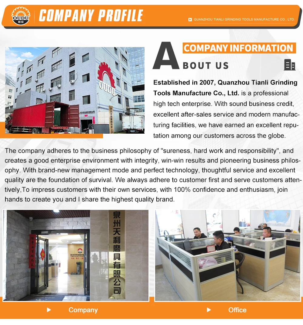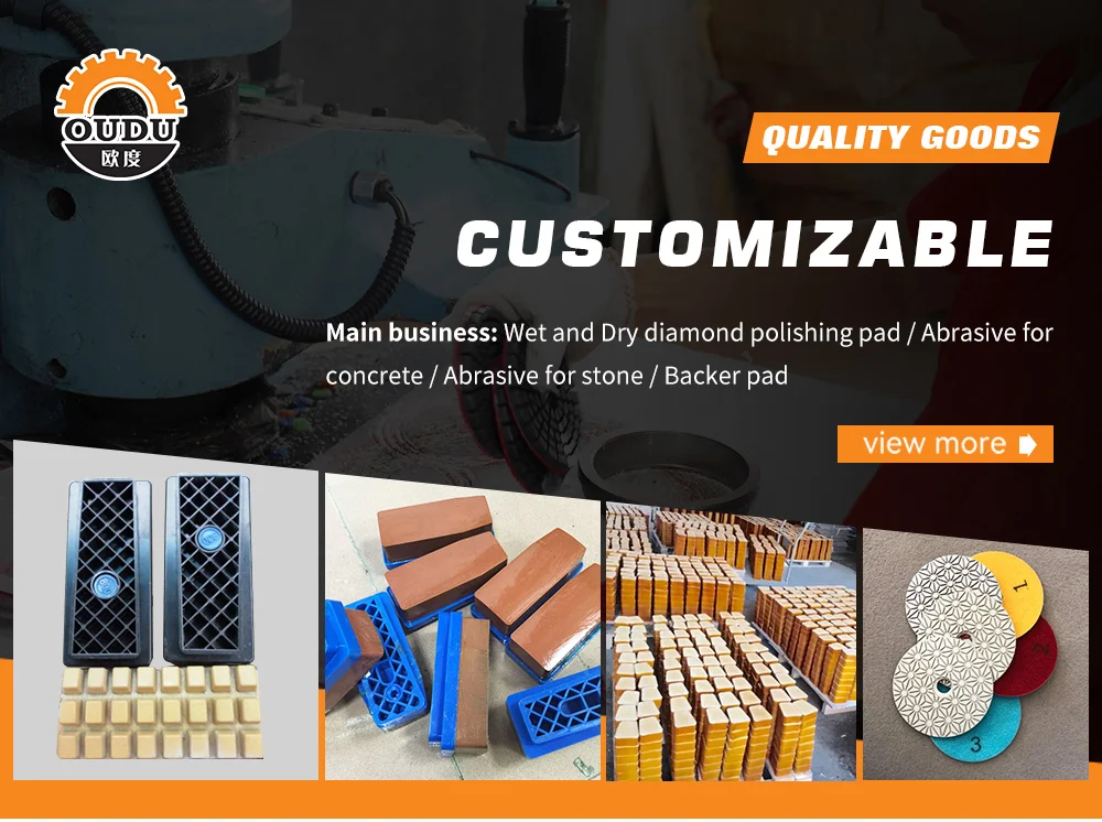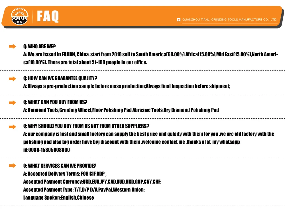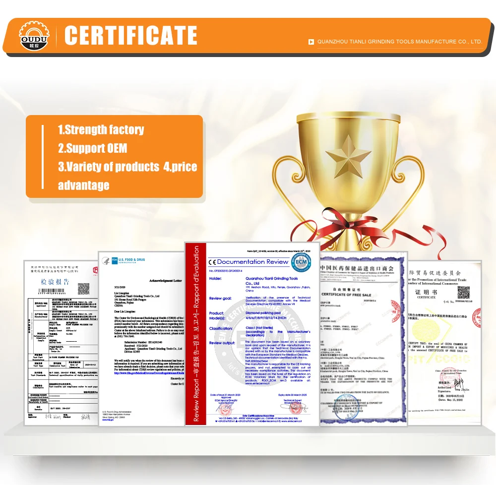 Quanzhou Tianli Grinding Tools Manufacturer Company is currently a professional manufacturer of abrasive tools. We are 2 3 years old factory with diamond tools, grinding tools, diamond polishing pad, floor polishing pad. One month can make diamond polishing pad 3 50 000 pcs per month, our factory have 6 000 square meters, have 4 floors, we have stock 1 000000 pcs diamond polishing pad, if you want min order we can send for you within 1 day. when you have new order, our Q C will check each pad for you, keep each pad with good quality. Every year we have 10 type new product for the market. We can send all products with good price and good quality with fast shipment for you all way. we also accept O E M all way. Just tell me what you want, we will supply for you at the first time. we have a professional team sever for you, if your order have any problem or have some questions with product, please let me know, we will give you answers as soon as possible. "People oriented, integrity career" is the corporate culture, core values, "the prestige first, customer first" is our principle of service, your satisfaction is our eternal pursuit. We are ready to your sincere cooperation, mutual benefit and create cause. Use our products for the building blocks of your success!