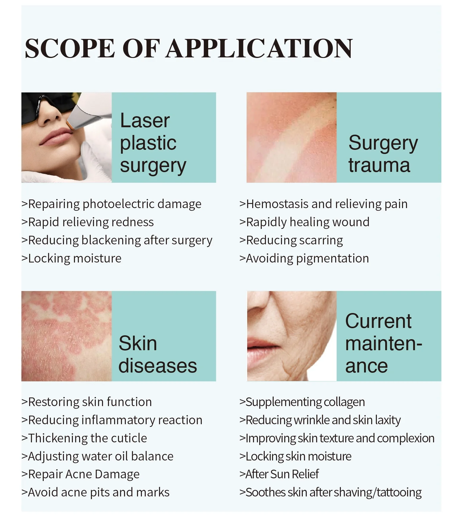 Features | Restores the barrier function of the skin,and is suitable for treating local skin itching, burning,skin tightness,pain,etc.Caused by dermatitis and eczema. lt can repair the skin barrier function and is suitable for dealing with skin dryness and desquamation, erythema, papules, couperose and skin atrophy and thinning caused by damaged barrier function.It can also prevents scar formation and pigmenta. |
