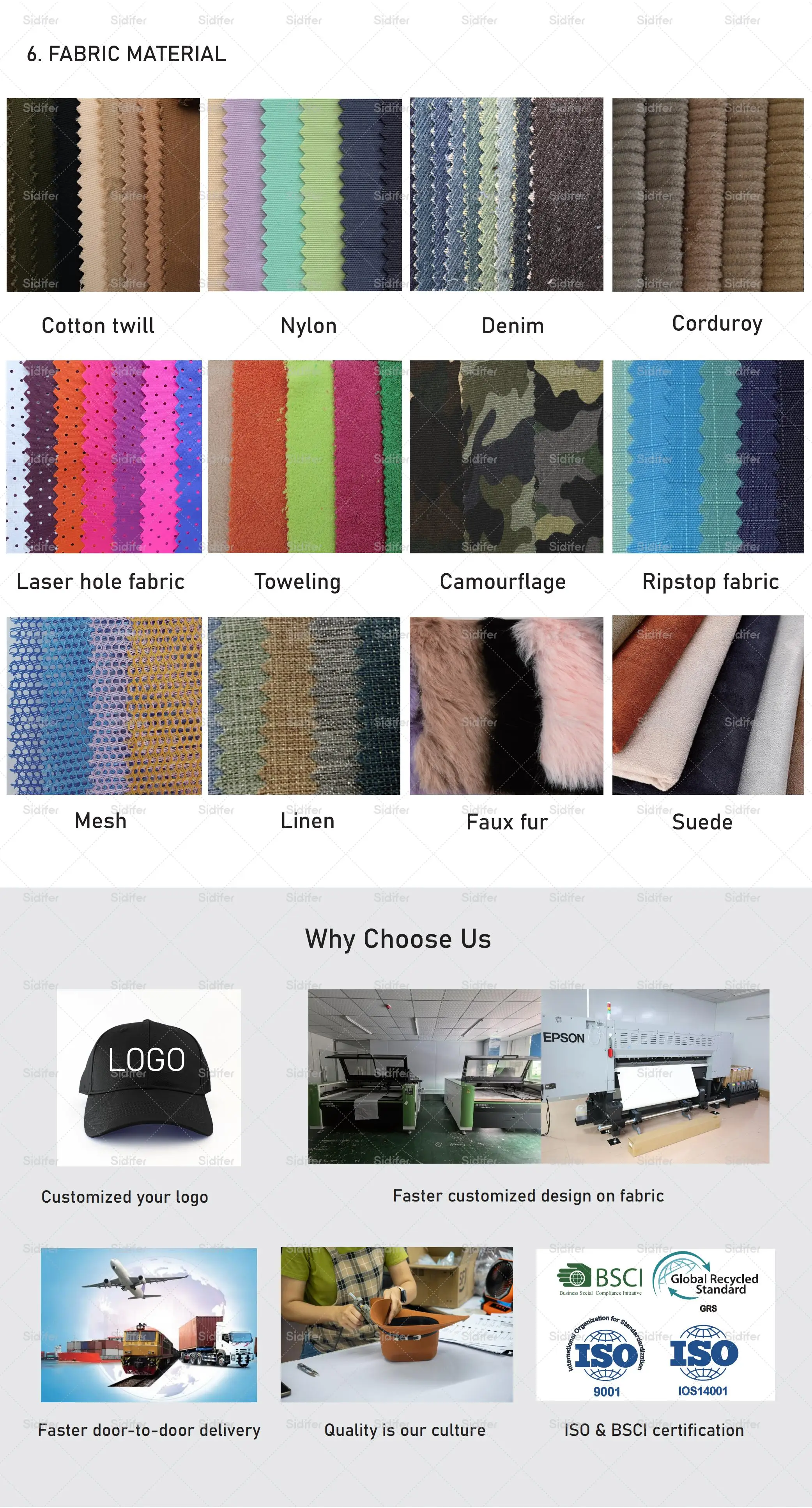 3.Material | custom material | Other material: BIO-washed cotton, heavy weight brushed cotton, Canvas, Polyester, Acrylic and etc. | |
