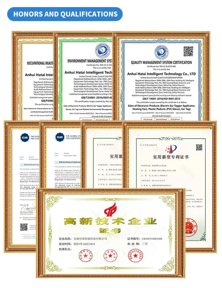 Anhui Hatai Intelligent Technology Co., Ltd is a leading provider of high-quality animal ear tags designed to meet the diverse needs of livestock farmers,researchers, and wildlife conservationists. Recognized as a national high-tech enterprise and a double-software enterprise,we have a high-quality R&D team composed of numerous PhDs and Masters, and we own multiple independent intellectual property rights.Our product line includes, but is not limited to, electronic payment, mobile payment, RFID application devices, smart cards, and related application development and production。