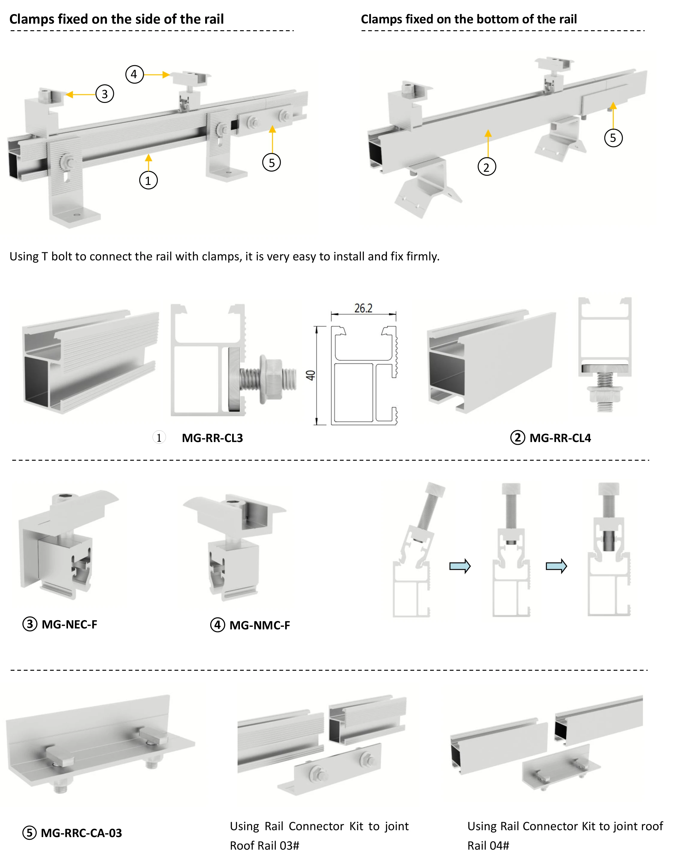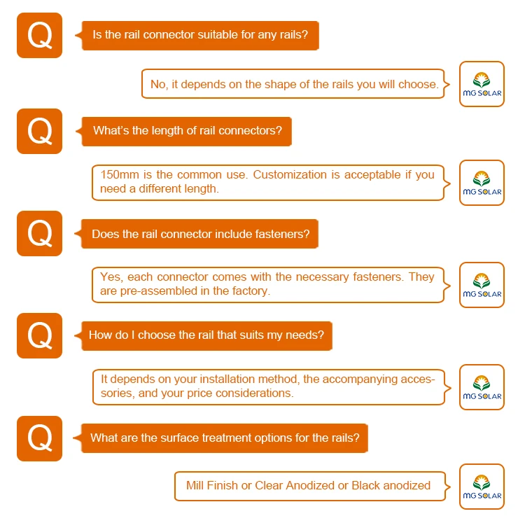 MG Solar rail connectors are designed for different kinds of solar rails. We provide several kinds of solar rail connectors for your options. They all with high quality, high strength and cost effective. Hope that our products will meet your satisfaction.