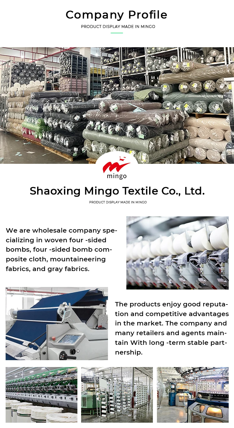 Product Category Company Profile Packing & Delivery FAQ welcome cooperationShaoxing Mingo Textile Co., Ltd. provides a wide range of high-quality fabrics for windbreakers, mountaineering clothes, ski suits, beachwear, sun protection clothing, and more. Our main products include woven four-way stretch, four-way stretch composite fabric, mountaineering cloth fabric, and grey fabric, all at reasonable prices and of excellent quality. We adhere to the business philosophy of credibility first, win-win cooperation, and quality assurance. With our diverse product features and low-profit, high-volume strategy, we have won the trust and support of our customers. Whether you are engaged in garment manufacturing, outdoor sports or other industries, Mingo Textile can provide you with satisfactory products and services. Our products have excellent quality and durability to meet the needs of different customers. We can provide special functions such as waterproofing, windproofing, moisture permeability, warmth retention, and flame retardancy. We have a professional technical team that can provide you with professional technical support and after-sales service. We will serve you wholeheartedly and look forward to establishing a long-term and stable cooperative relationship with you. FAQ |