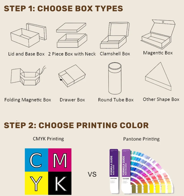 A: The basic elements are the box structure, material, quantity, size, color, logo finishing, accessories. If you have no idea about it, please advise your product for better recommendatio |