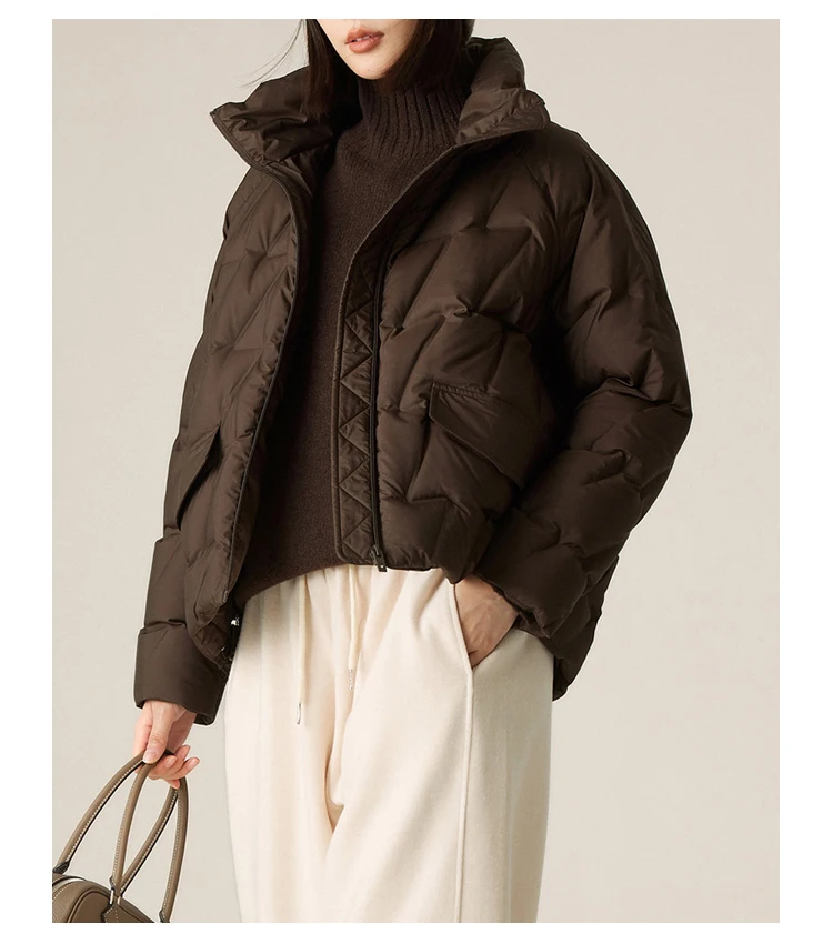 Product Name : | Medium-thin laminated stand-up collar white duck down short down jacket for women with raglan sleeves | ||||||