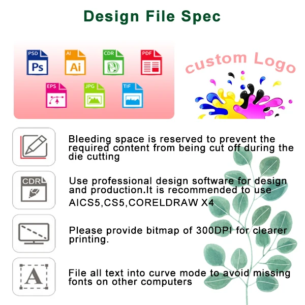 -Yes,generally speaking, we need you to provide AI or PDF files.High resolution(300 dpi and above) image format files are also available!If you only have a preliminary simple idea, it doesn't matter, we can help you make a Die-cut model!All we need to do is add your ideas to it.