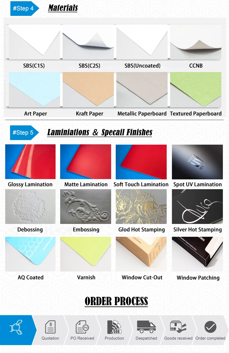 Material | C1S Art Paper/ C2S Art Paper/ Gold Art paper/ Silver Art paper/ Textured paper .. ect Thickness: 300/350/400GSM Wide Range for Your Selection. | |||