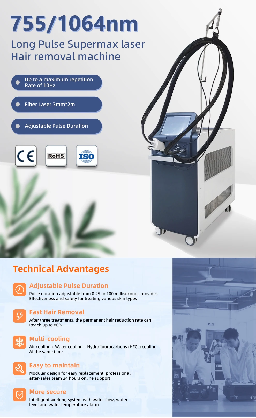 1.Permanent hair reduction for patients of all skin types, including those with thinner/finer hair; 2.Benign Pigmented Lesions Removal; 3.Diffuse Redness&Facial Vessels Removal; 4.Spider & Leg Veins Removal; 5.Nail Fungus Treatment;