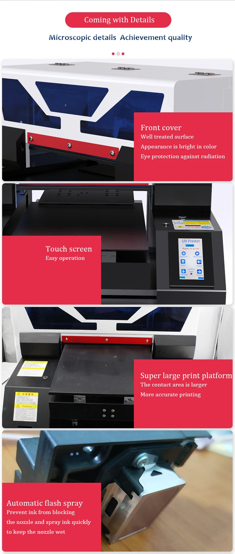 Function | Support printed with almost unlimited material, for example: mobile phone shell,Clothes,wooden,metal, golf,stone plate relief, acrylic card, purse, tempered film customization, wallpaper, tile, U disk, CD and so on. |