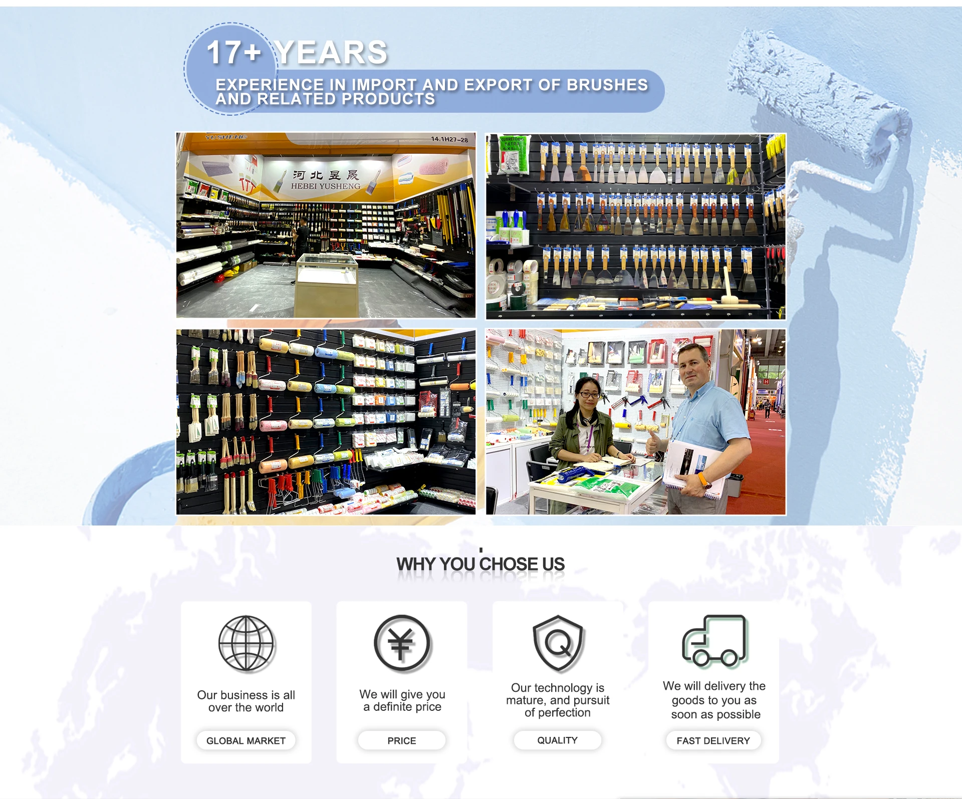 More than 17 years import and export experience of paint tools and related . Industry and trade integration . We are more professional in the paint tools . Our products contain : paint brush , paint roller , paint brush set , paint tools extension pole ...
