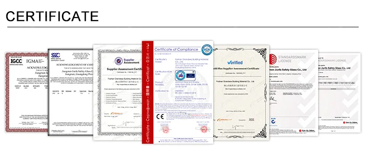 Glass Type | 1.Single toughened glazing:6mm/8mm/10mm/12mm... 2.Double toughened glazing:5+12A+5mm/6+12A+6mm... 3.Laminated glazing:5+0.38PVB+5mm/6+0.76PVB+6mm... 4.Low-E glazing:Green/Bule/Brown/Golden... 5.Other glazing:frosted glass/crystal glass/art glass... |