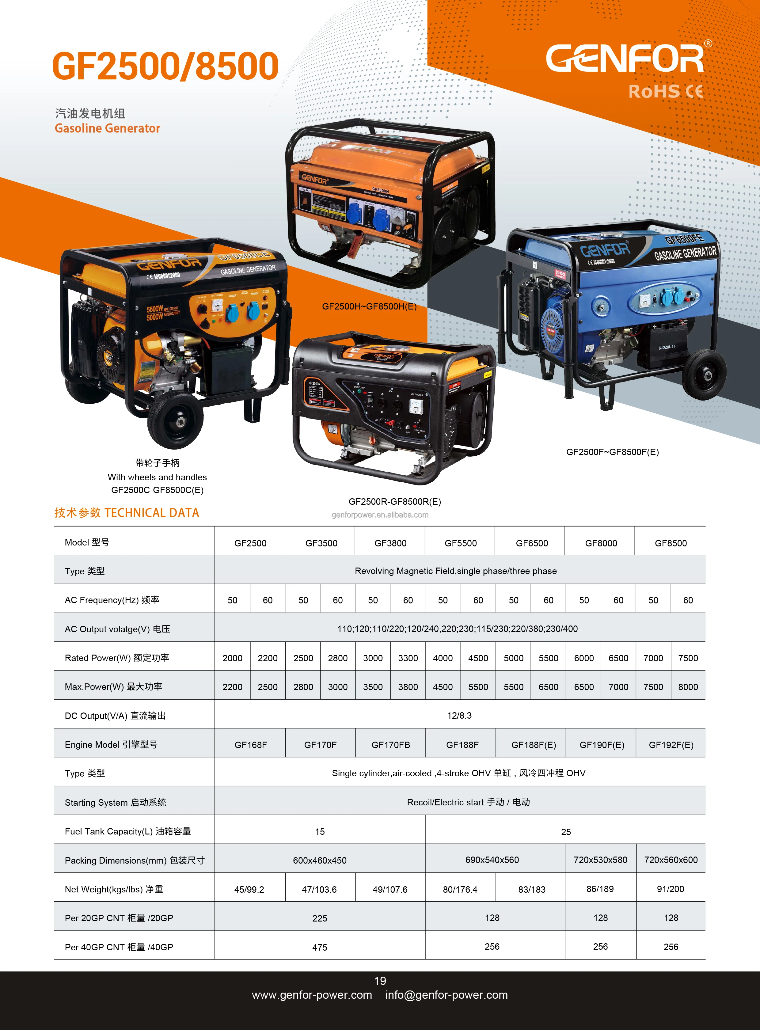Single cylinder, 4-stroke, air-cooled, TCI. *Automatic air bleeding mechanism *AC Voltmeter *DC Output *AC Circuit Breakers *DC Fuse Protection *Full-power Switch on Dual Voltage *Extra Large Fuel Tank with Fuel Gauge *Large Capacity Silent Muffler Optional Equipped *Low Oil Shut Down *wheel Kit *Electric Starter*Battery *Remote start function