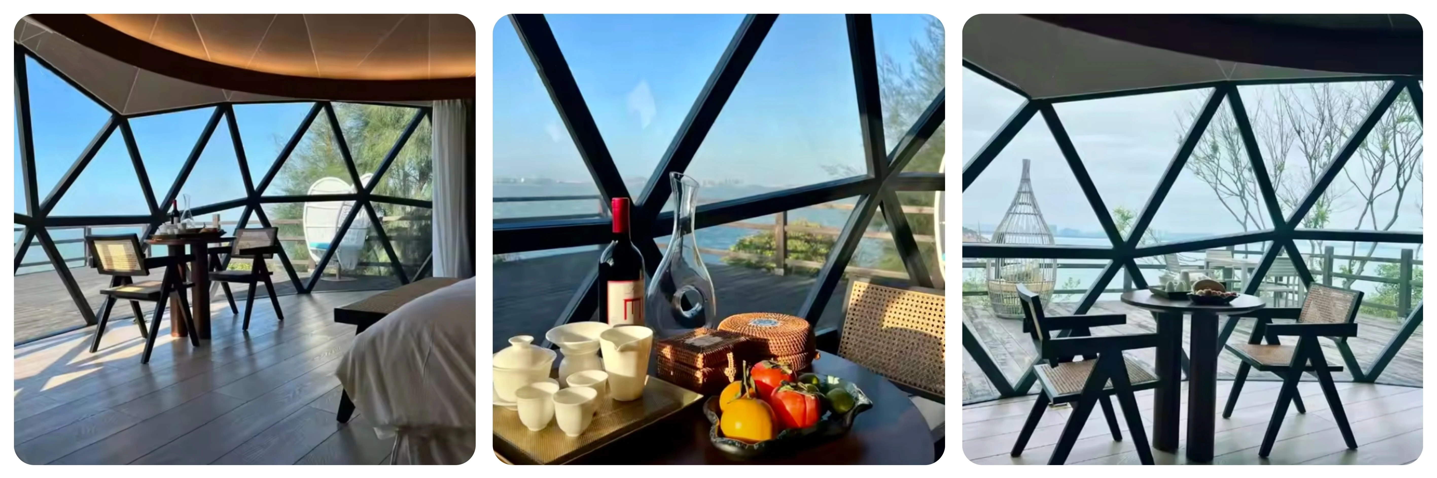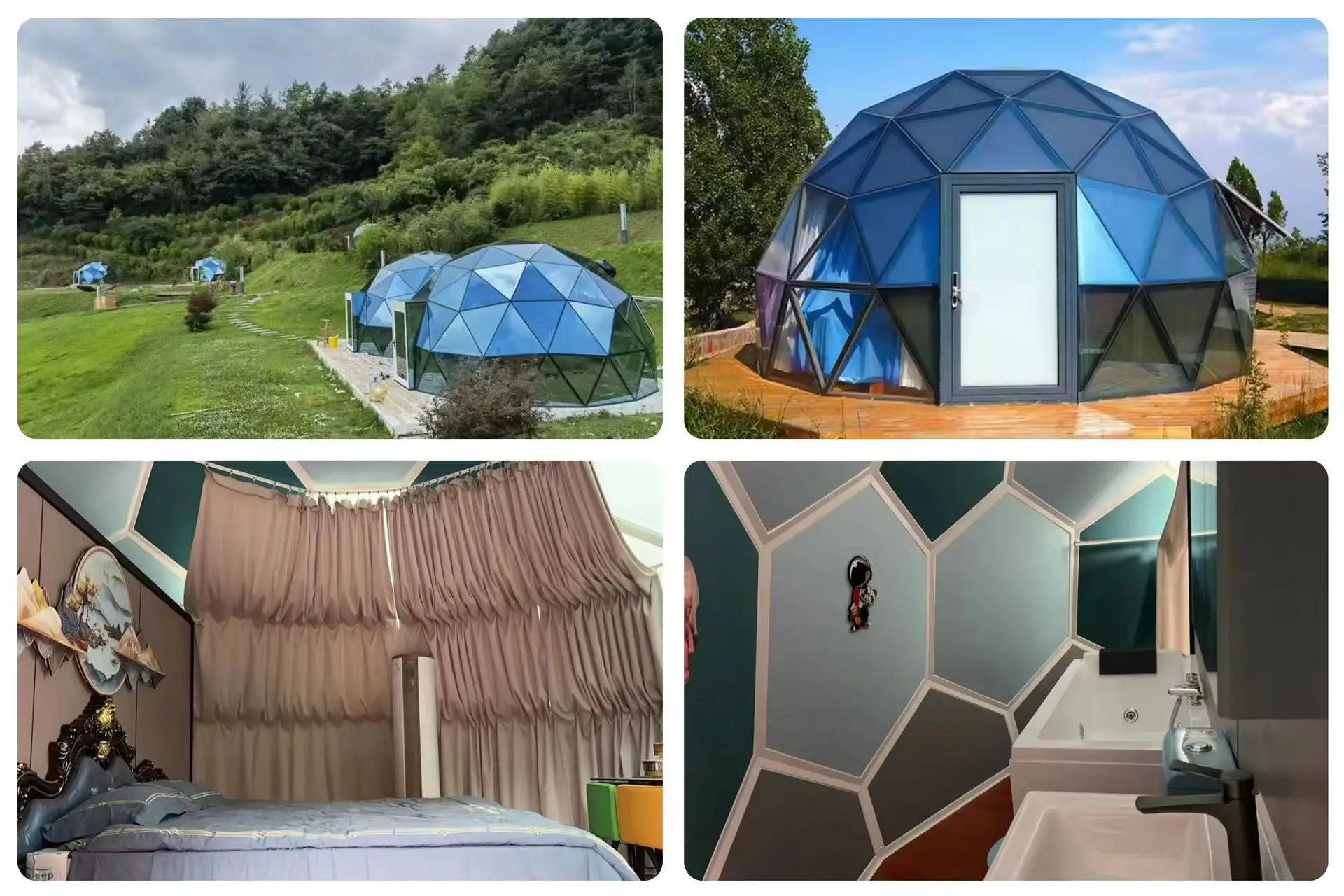 Dome Accessories | Exclusive design of insulation / Curtain / Glass windows by hand / Electric glass window / Floor system / Bathroom / Exhaust solar fan. | •Insulation: Temperature control. •Curtain: provide privacy, light control. •Glass Windows. •Floor System: Offers stability and comfort. •Bathroom: Offers convenience and comfort. •Exhaust Solar Fan. | ||