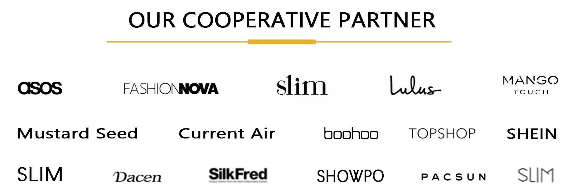 We have worked with many international corporations including FashionNova, Lulus, Current Air, Top Shop, ASOS, MANGO, Mustard Seed, and Forever 21. We also provide services to wholesalers such as DO+BE and Honey Punch. After consistently delivered high-quality