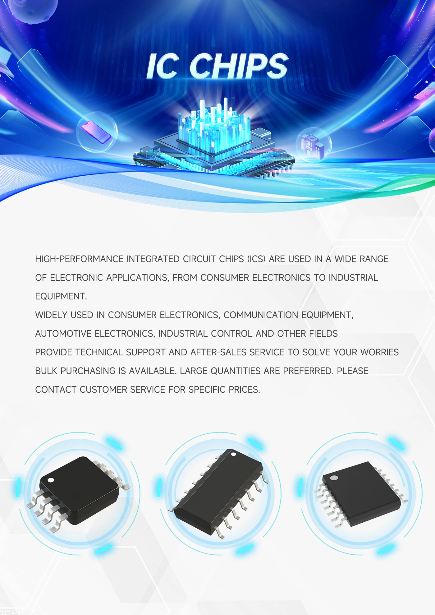 Company Profile: We are a leading global distributor of electronic components, committed to providing high-quality electronic components and value-added services to customers around the world. With 15 years of industry experience and an extensive supply chain network, we provide customers with one-stop procurement solutions to meet the needs of various electronic product manufacturers. Distribution of electronic components: We focus on the distribution of various types of electronic components, including semiconductors, integrated circuits, resistors, capacitors, inductors, connectors, etc., covering a wide range of product lines from standard parts to customized components. Cross-border procurement and distribution: We have suppliers and customers in major markets around the world, and can provide full-process services from procurement, logistics to final delivery, ensuring that products arrive safely and quickly during cross-border transportation. Global supply chain: We have a global supplier network and can quickly obtain high-quality electronic components to ensure the continuity and stability of supply. Customized services: According to the special needs of customers, we provide customized procurement solutions and logistics services to ensure that the specific requirements of customers are met. Technical support and solutions: We not only provide products, but also provide customers with professional technical support and solutions to help them optimize designs, improve product performance, and reduce overall procurement costs. Strict quality management: We conduct strict quality inspections on all products to ensure that each batch of components meets international standards and reduce customer risks during use.