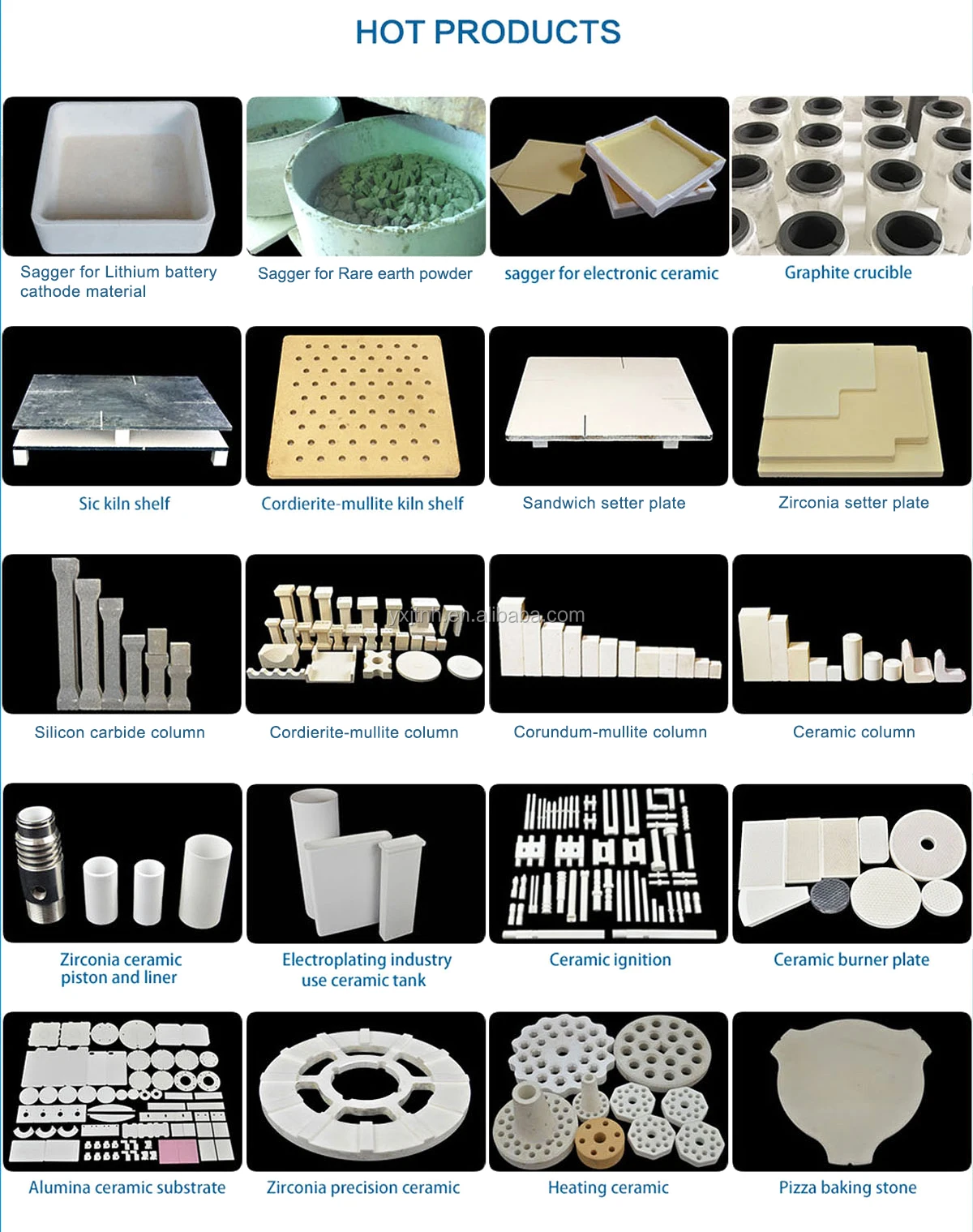 We mainly manufacture industry furnace refractory material such as Setter plate, Push plate, Pillar , Sagger, Technical Ceramic, Furnace material and so on. Our product is widely used to sinter Magnetic Material, Electronic Ceramic, Daily Ceramic, Powder Metallurgy, Rare Earth Battery Material and so on. Our sandwich setter plate, electronic ceramic used sagger, Lithium battery cathode material sintering sagger are very good , and they have been leader products in our field.