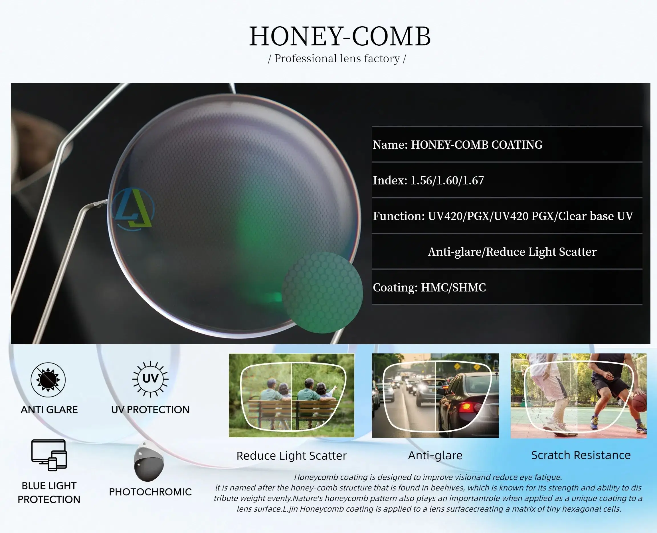 Honeycomb coating is designed to improve vision and reduce eye fatigue. lt is named after the honey-comb structure that is found inbeehives, which is known for its strength and ability to distribute weight evenly.Nature's honeycomb pattern also plays an importantrole when applied as a unique coating to a lens surface.L.jin Honeycomb coating is applied to a lens surfacecreating a matrix of tiny hexagonal cells.