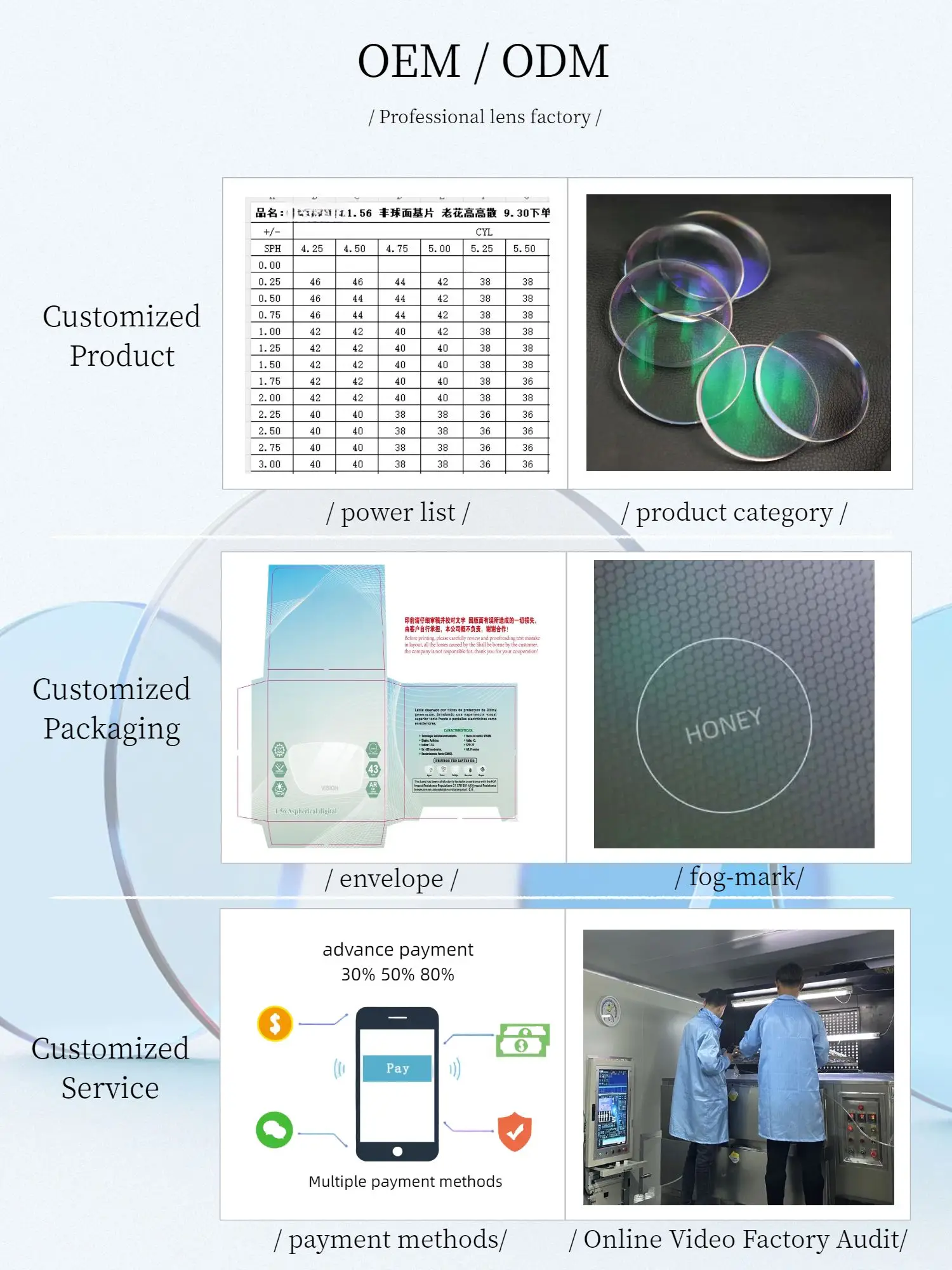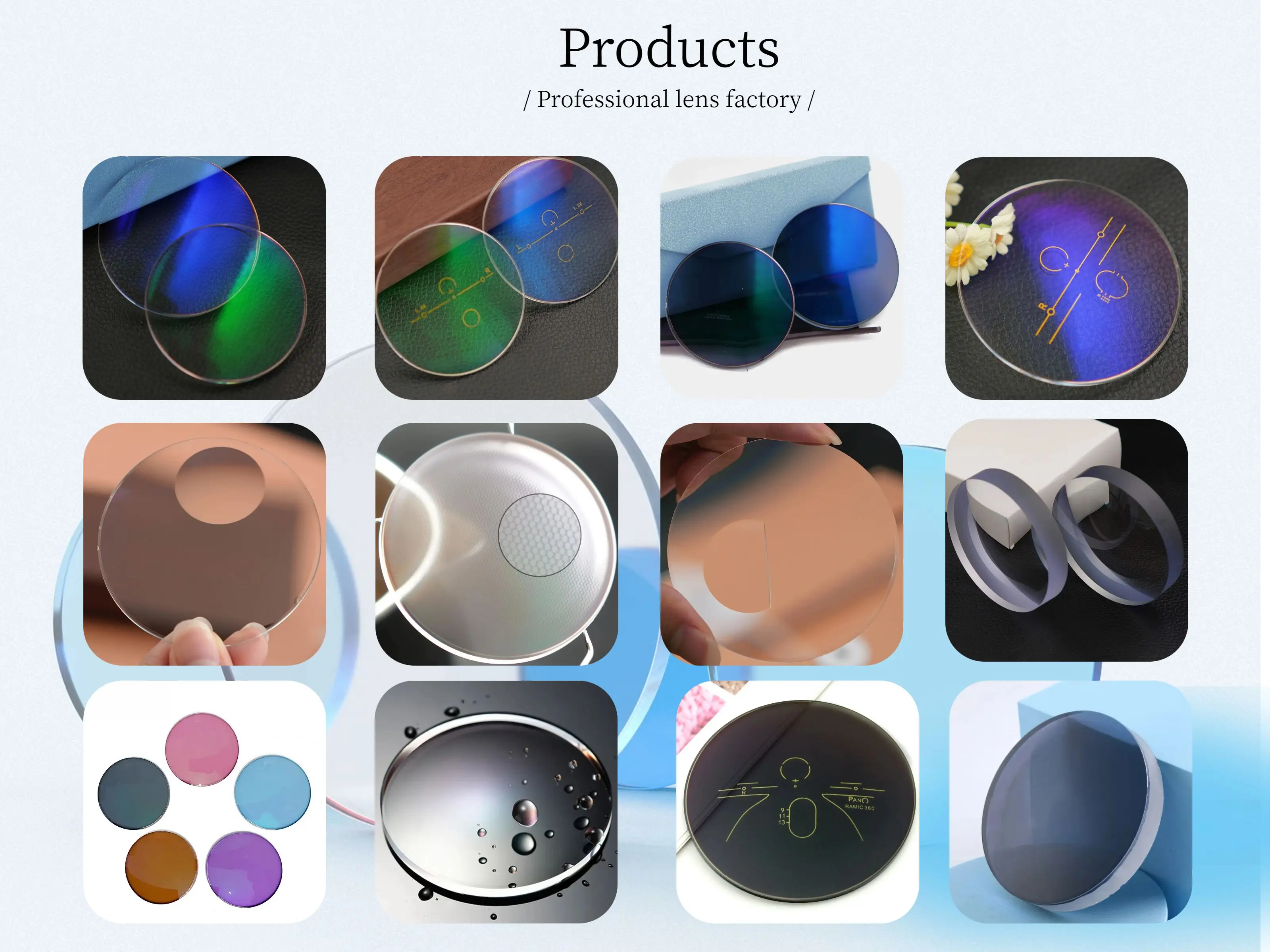 We are able to produce regular items as 1.499, 1.56, 1.60, 1.67 ,and1.74 series, and successively created Bifocal, Photochromic, Polarized and Progressive which is function for students.Since establishment, we have continuously new improvementand inventing varied lenses which is suited to future market. Meanwhile we also rely on our own technology and abundant funds to actively carry out "Production, Learning and Research" cooperation with internal and abroad universities and research labs, By means of standard quality. variety and complete customer service system, we develop and serve all our clients who are from domestic or international.
