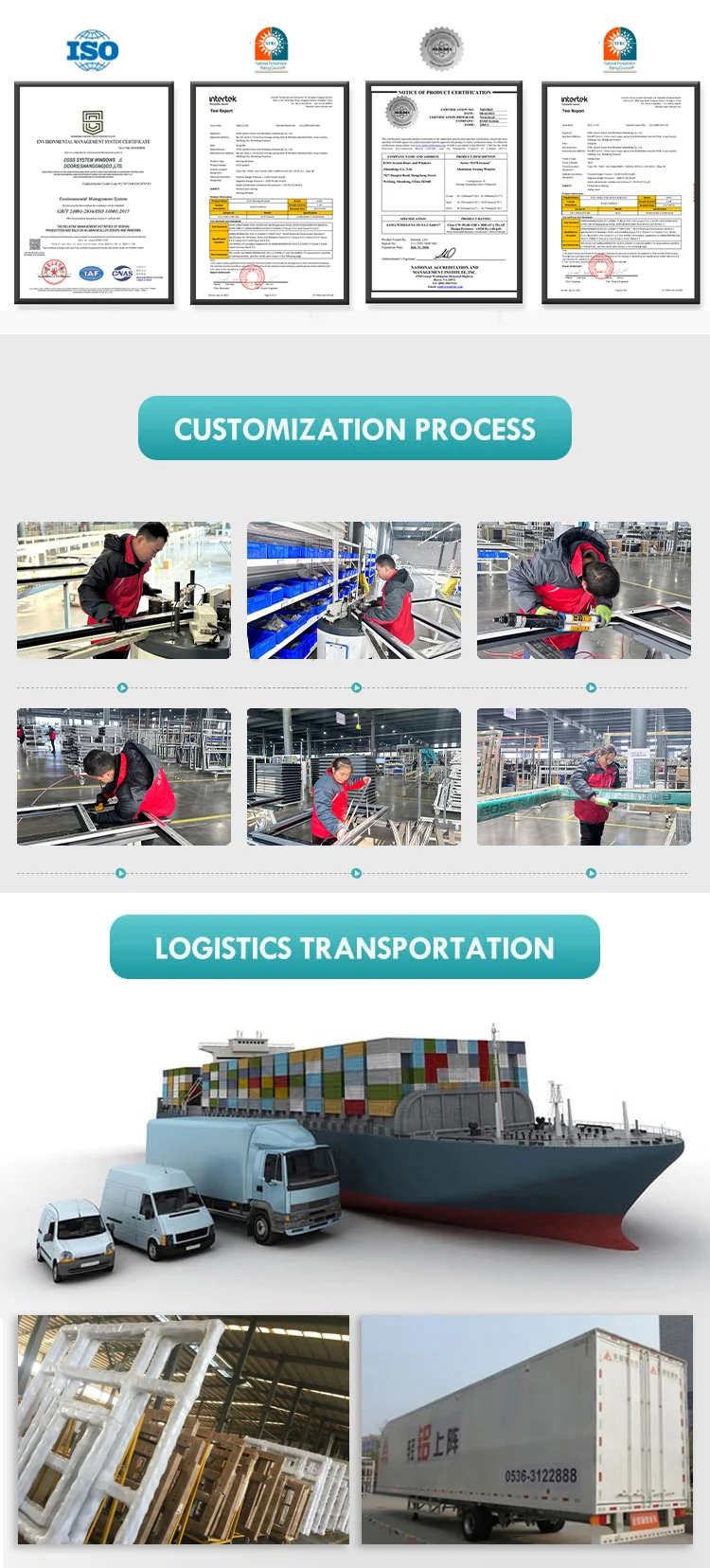 For aluminium profiles, we got CE certificate in 2017, and for windows and doors, our EOSS system passed the test by PHI from Germany.