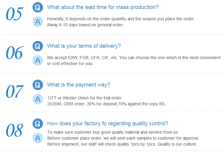 Delivery Time | 10-15 days after receiving the payment for stock, for mass production, about 20-30 days. | ||||||
