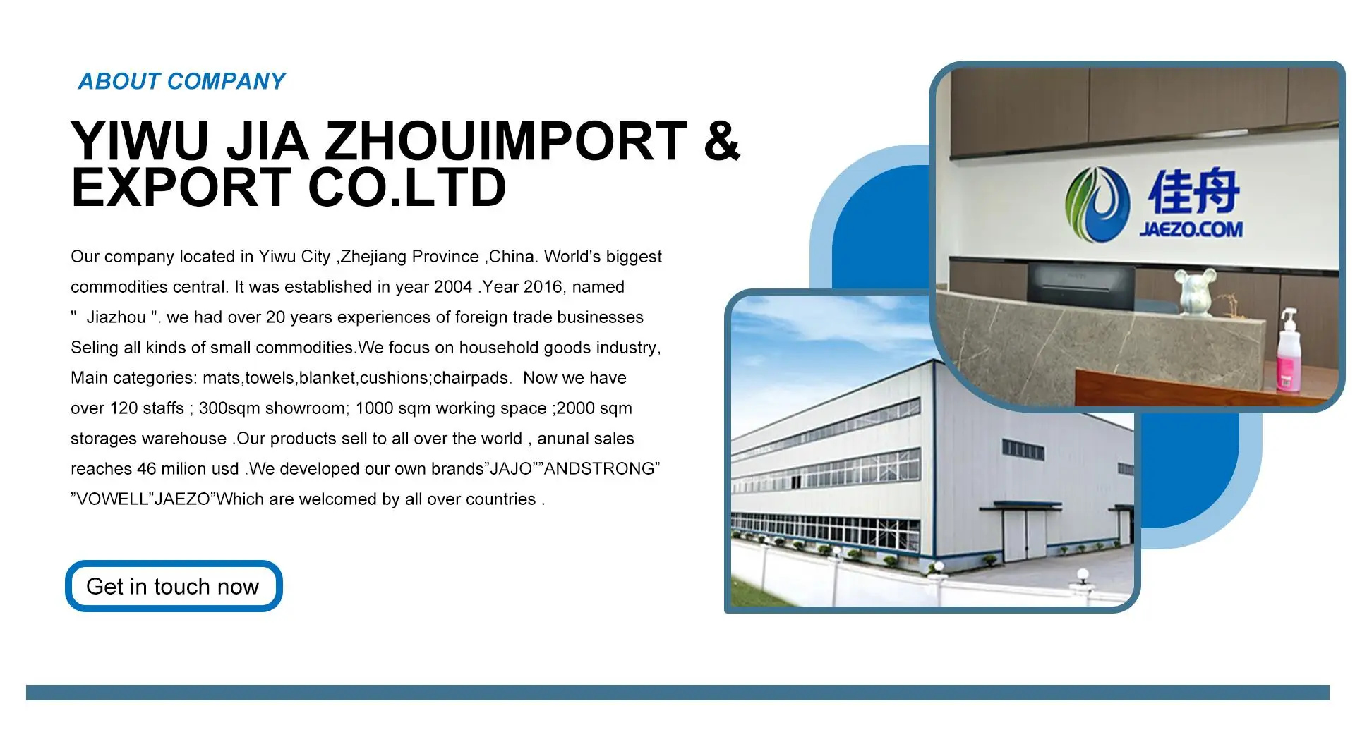 2004 .Year 2016, named “ Yiwu Jiazhou Import & Export Co.ltd “. we had over 18 years experience of foreign trade businesses .
