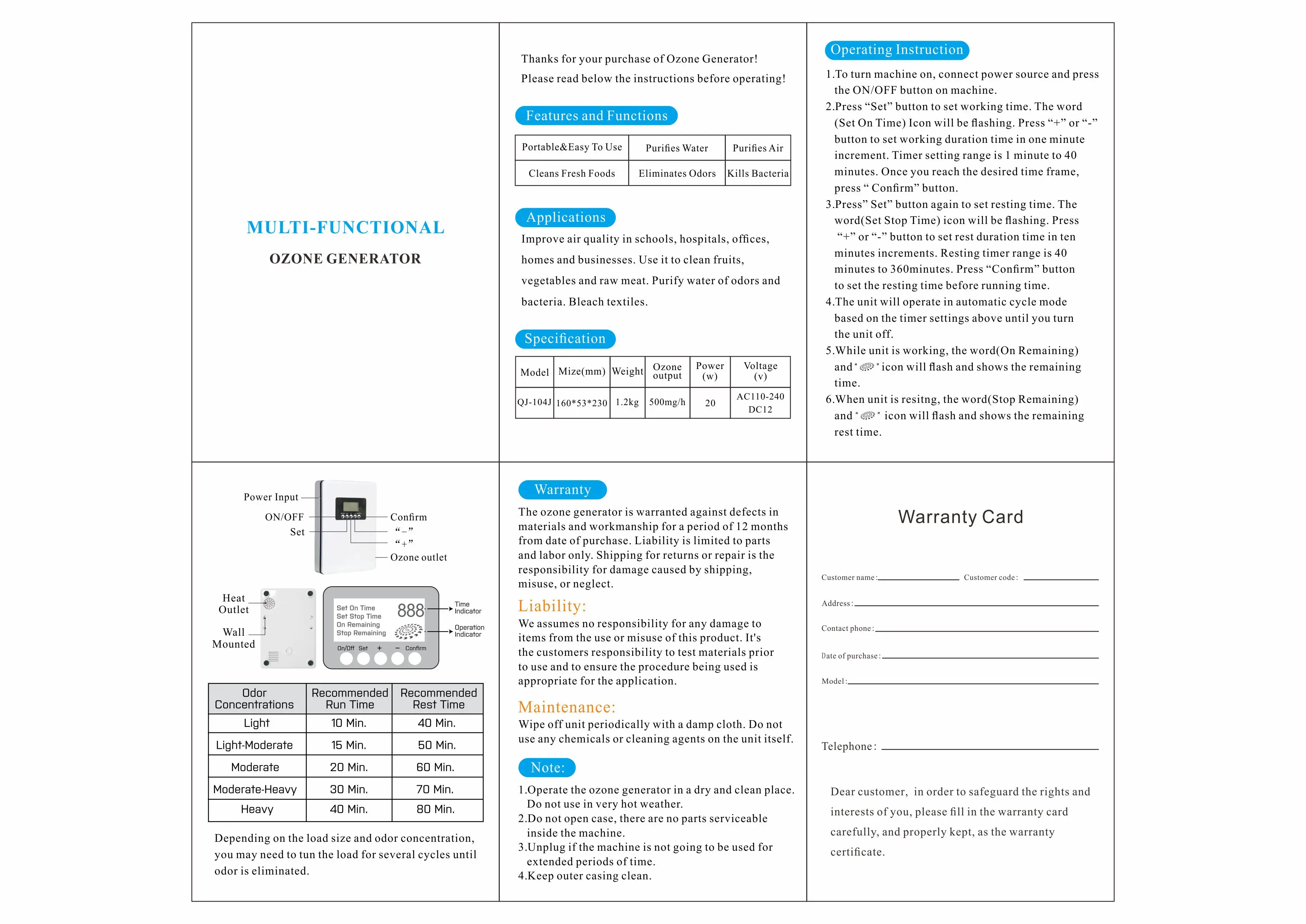 model | JH-104J | ozone output | 500mg/h |
