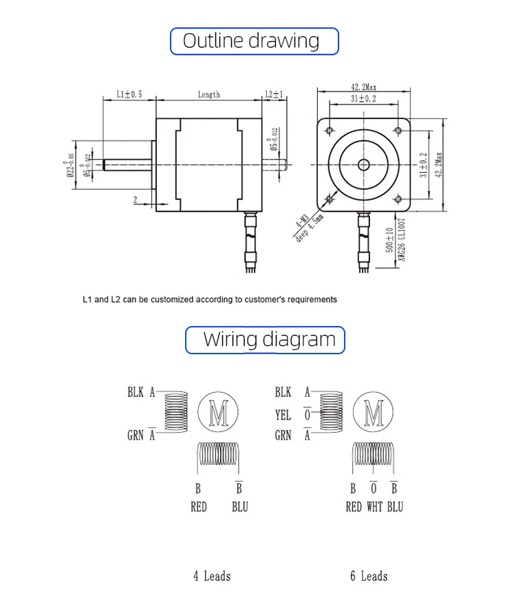 Model NO | Step Angle(°) | Phase Inductance(mH) | Rated Current(A) | Holding Torque(N.m) | Detent Torque(N.cm) | Rotor Inertia(g.cm2) | Motor Length(mm) | Lead Wires No. | Weight(g) |