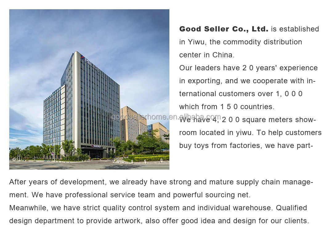 GOOD SELLER is a leader in the field of general merchandise and buying agent business. Based in Yiwu China, the company has more than 100 salesman and over 18 years' trading experience, We have three 6000sqm showrooms in Yiwu, Ningbo&Shantou, displaying more than 50,000 items directly from over 8,000 factories. Our customers are form more than 118 countries, many of them are from chain stores and supermarket.