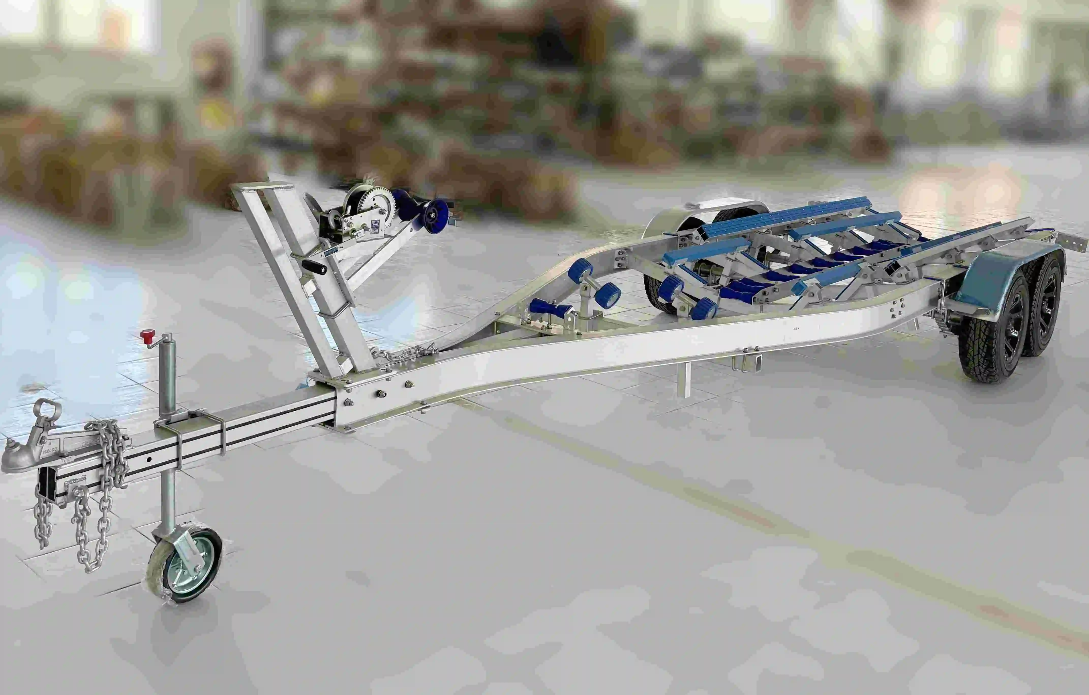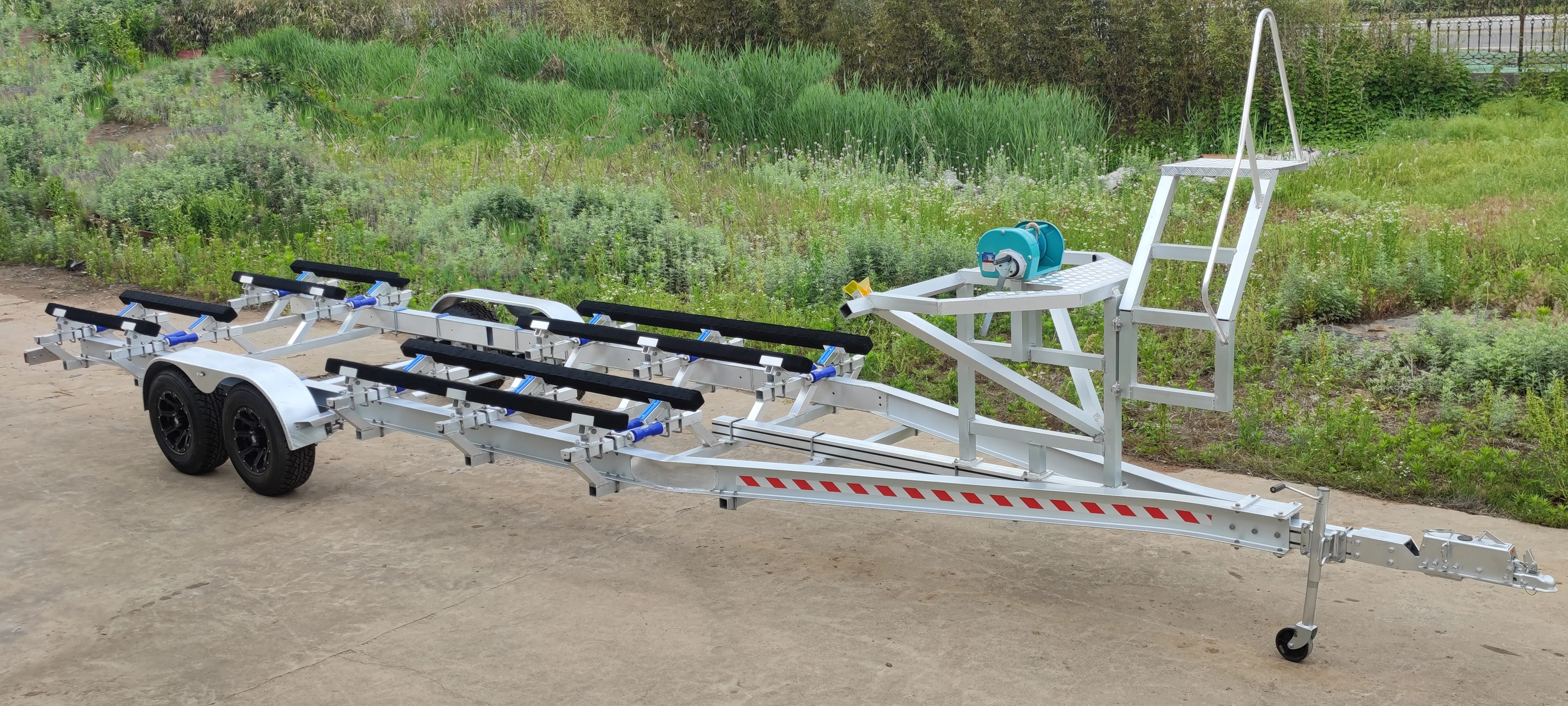 Note: HRAB2527TH7H (AB= ALU BOAT TRAILER)(T:TANDEM AXLE) (H7: LESS ATM 4080 KG)(H7H: LESS ATM 4500 KG) 25 for(ft) the length of the boat 27 for(ft) the length of trailer The boat size for a boat is 25 ft Option Type: 1. wooden bunks & poly bunks & wobbly rollers 2. multi keel rollers skid 3. hydraulic brake 4. torsion shaft 5. electric brake over hydraulic 6. electric winch 7. galvanized wheel 8. spare tire 9. OA stainless steel bolts |
