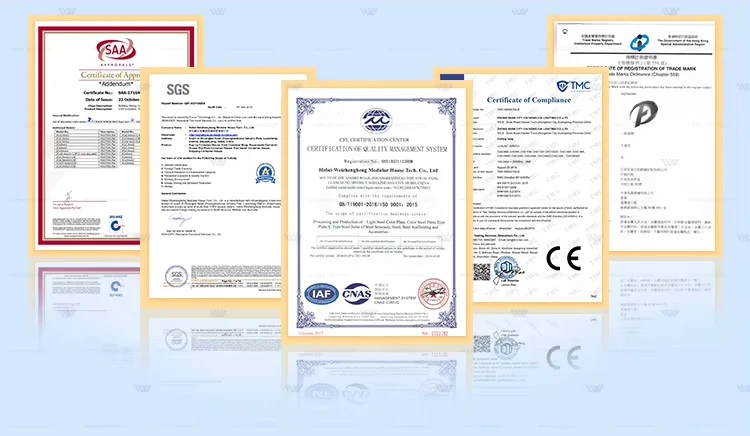 Advantage | (1) Fast installation: 2 hours/set, save labor cost; (2) Anti-rust: all material use hot glavanized steel; (3) Waterproof structural waterproof design; (4) Fireproof: fire rating A grade; (5) Simple foundation; (6) Wind-resistant(10 grade) and anti-seismic(10 grade) (7) Pre-installed (8) Suitable for living |