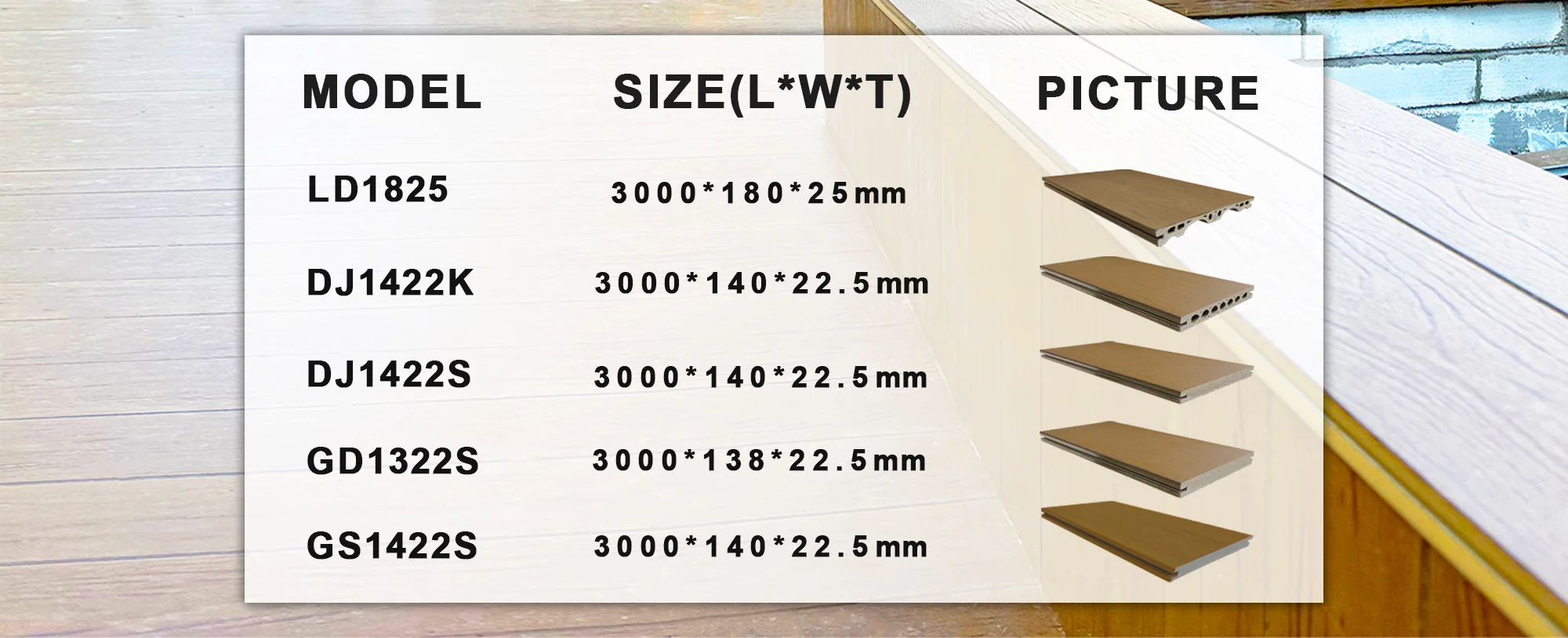 HIGHLIGHTS: | Lightweigh, extremely stable dimension, real wood touch, natural wood grain, easy maintenance, splinter-free | ||||||