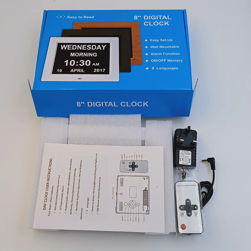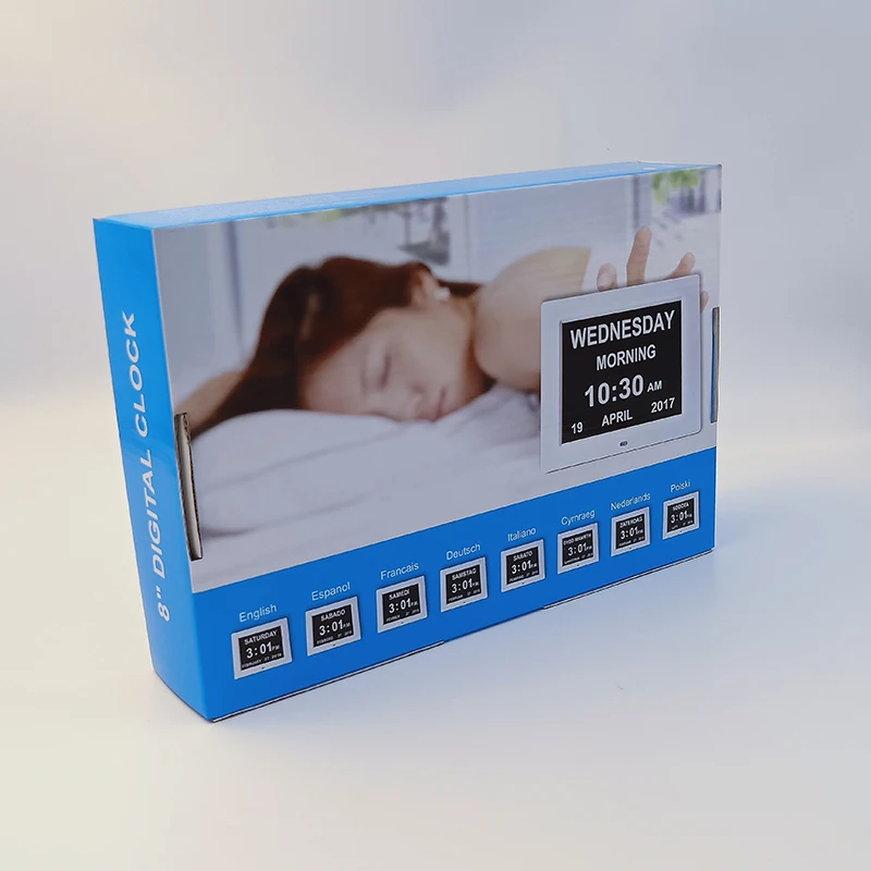 Main Function | 1. Display day, date, year in full abbreviation; 2. Display humidity, temperature, weather station information with 5 landscape images and 4 calendar clock interface; 3. Display multi-language words; 4. Alarm function, medicine reminder and screen power on/off setting; 5. Worldwide time zone and city selection to obtain time and weather information; 6. Connect wifi to broadcast weather,temperature,humidity and real-time calendar; 7.Play pictures & video by insert the USB; 8. Desk & wall mounted installation way; 9. Bespoke various of customer software and packaging demands; 10. Support private mold customization; | ||||||