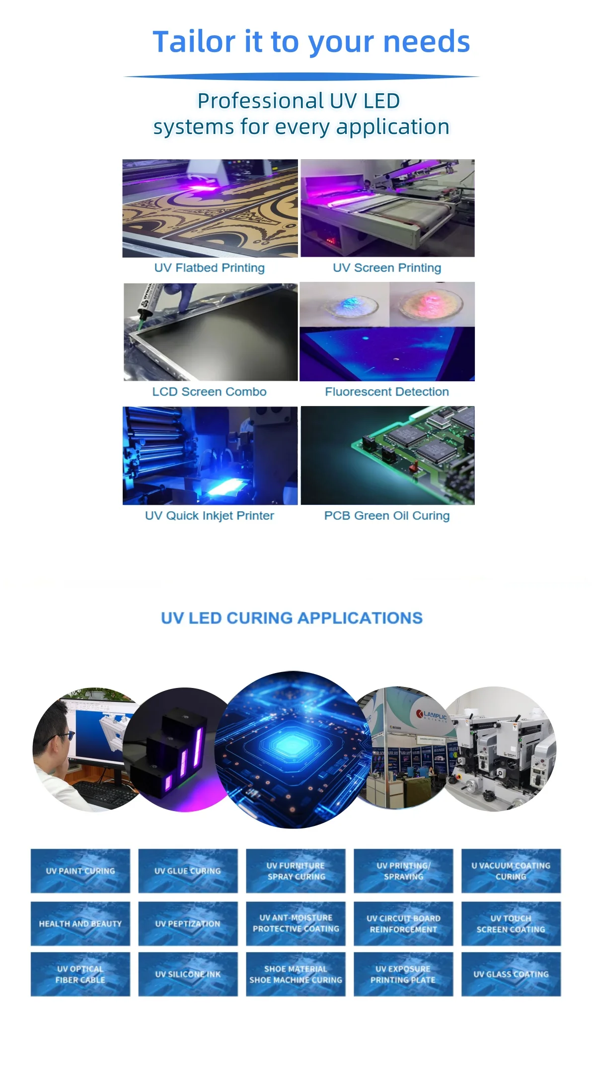 Lamplic 20 years of experience in UV application development, from UV LED module COB package, UV LED DC-DC driver, AC-DC POWER, TP controller, all the key technology we are professional. Also we know more about the UV applications, such as UV LED digital printing, flexographic printing, offset, screen, printing, UV film coating, metal printing, furniture LED paiting, concrete floor UV coating and so on.