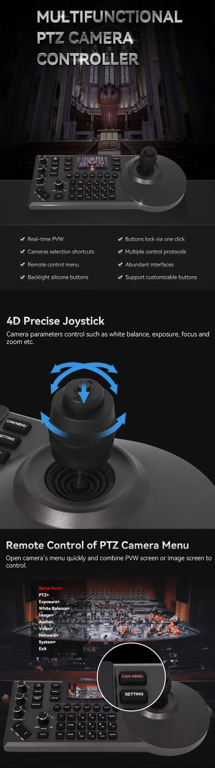 IP PTZ Joystick Controller with preview camera and real-time live streaming function- Key Features