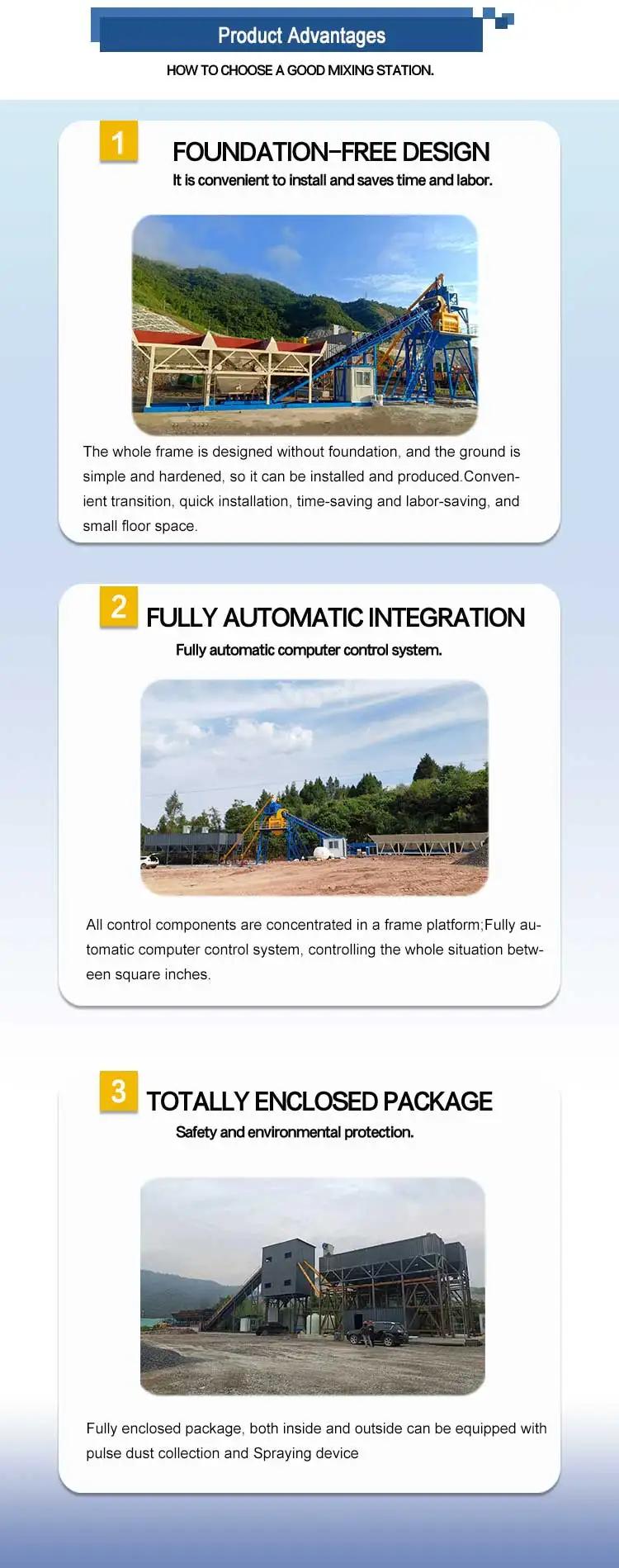 7. After weighing, the aggregates are fed into the concrete mixer separately using a secondary feeding method. The mixed concrete is discharged into concrete transit trucks through a cylinder or hydraulic pump, completing one cycle. |