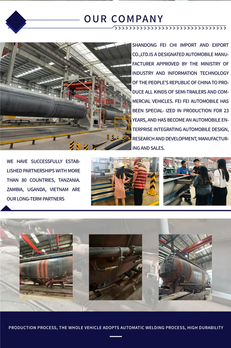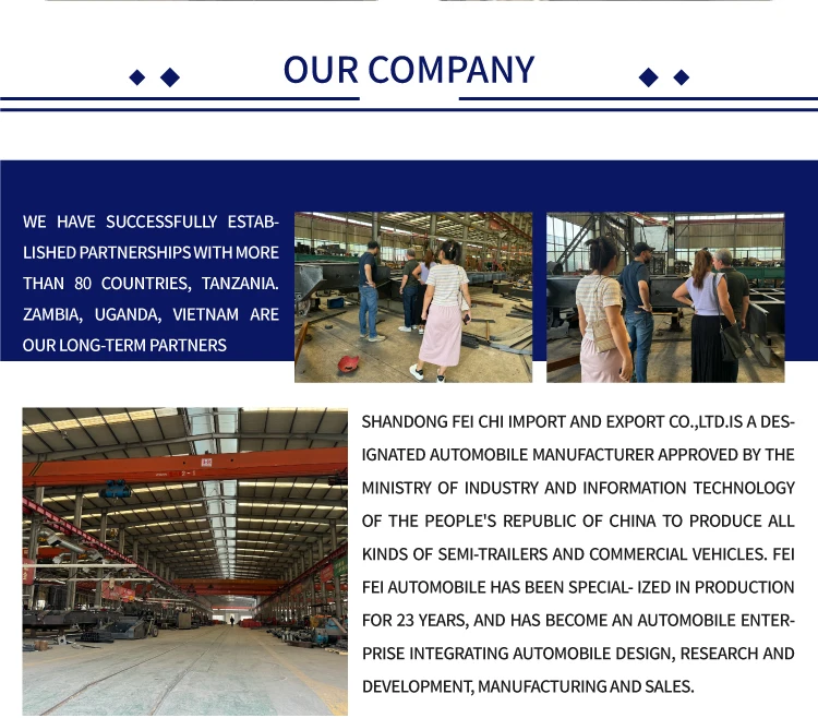 SHANDONG FEI CHI IMPORT AND EXPORT CO.,LTD.IS A DES.IGNATED AUTOMOBILE MANUFACTURER APPROVED BY THE MINISTRY OF INDUSTRY AND INFORMATION TECHNOLOGY OF THE PEOPLE'S REPUBLIC OF CHINA TO PRODUCE ALL KINDS OF SEMI-TRAILERS AND COMMERCIAL VEHICLES. FEICHI AUTOMOBILE HAS BEEN SPECIALIZED IN PRODUCTION FOR 23 YEARS, AND HAS BECOME AN AUTOMOBILE ENTERPRISE INTEGRATING AUTOMOBILE DESIGN, RESEARCH AND DEVELOPMENT, MANUFACTURING AND SALES.