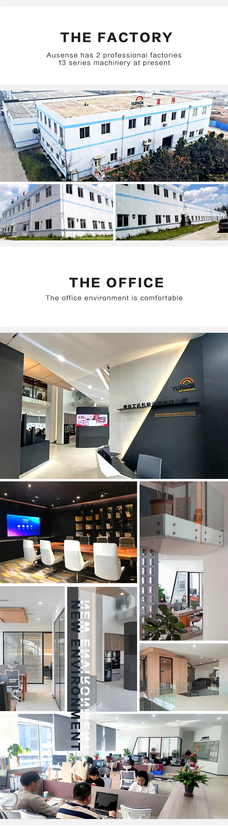 Qingdao Ausense has been established in 2008, which focus on the planning, R&D and manufacturing of automatic packaging production line. such as automatic carton packing line,shrinking wrapping line, Fully automatic pallet strapping line,Conveyor system and so on...... Ausense main brand is YUPACK, . All products have passed the CE certification of the European Union; Our productions have beening exported to Europe, North America, the Middle East, Southeast Asia and more than 30 other Countries. Since 2017, Qingdao Ausense had successfully introduced robots into our end of packaging production line which can effectively integrate into the application of enterprise MES manufacturing execution system, and provide a complete set of automation industry 3.0 to 4.0 transformation and upgrading services.
