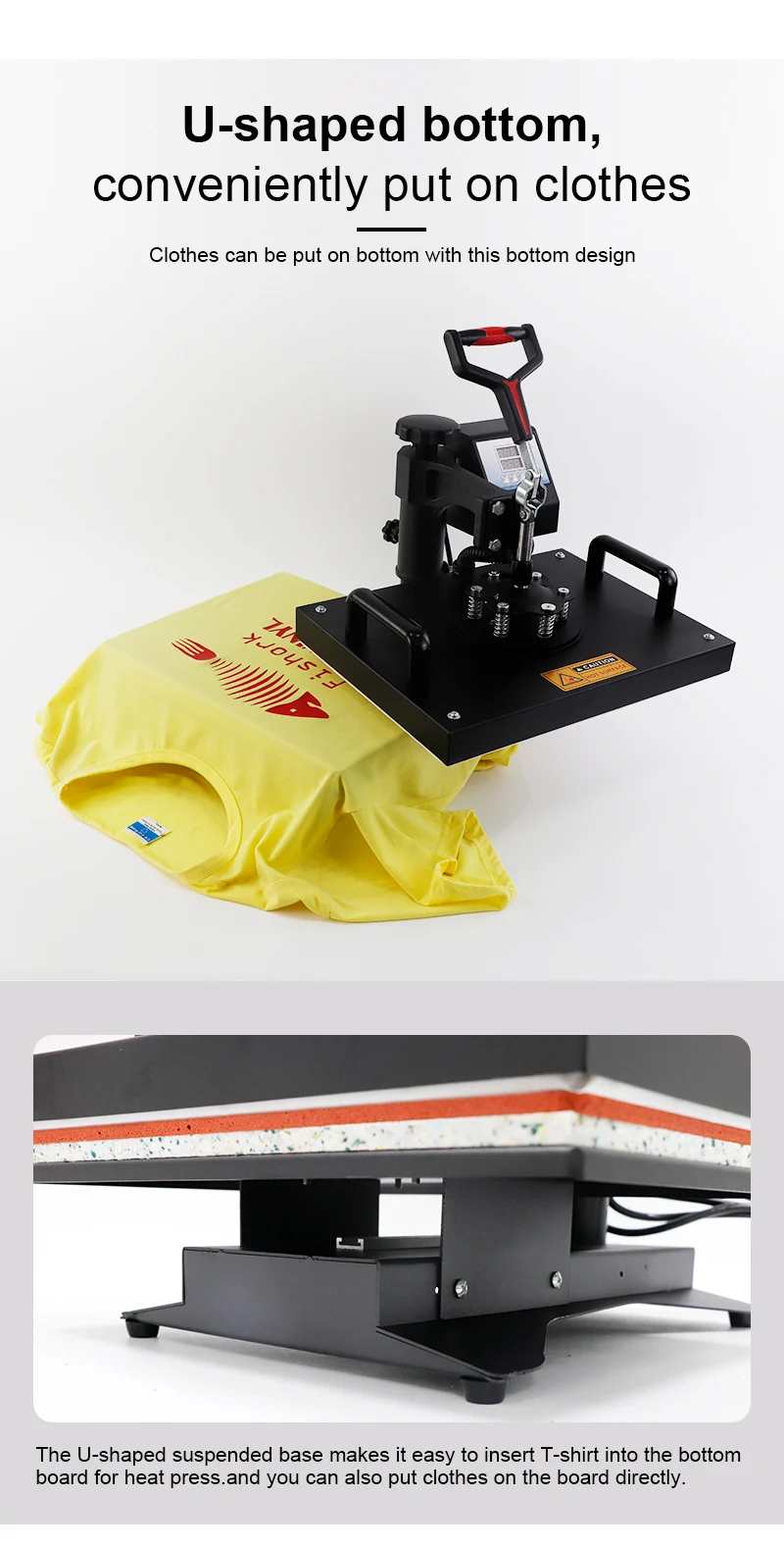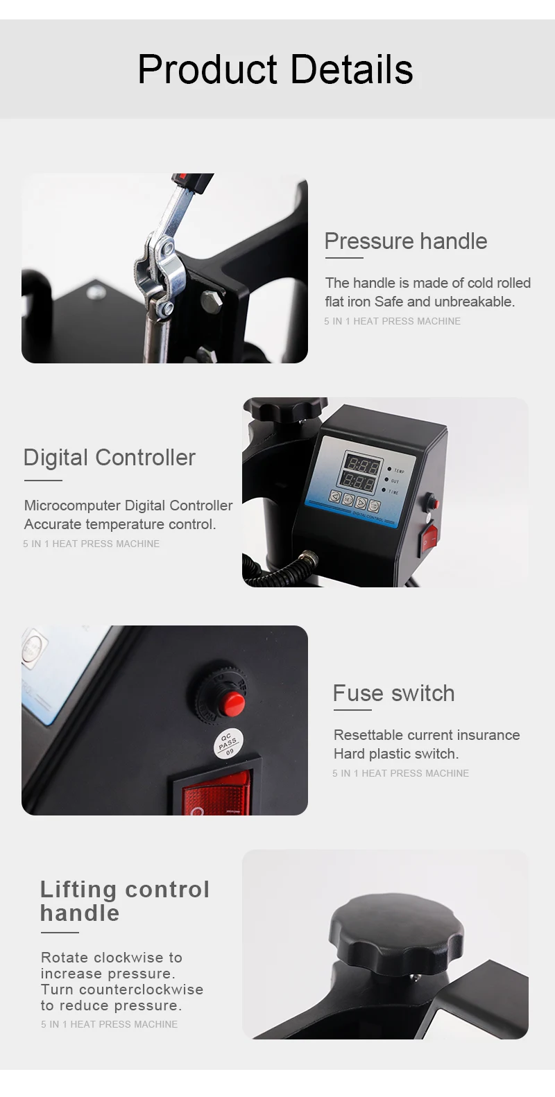 5 in 1 Heat Transfer Press Machine .The heat press machine is the machine that presses a transfer medium onto an imprintable substrate. Using high temperatures and pressures at a certain amount of time, the transfer medium is permanently embedded into the product.Heat presses are recommended for professional and satisfying results simply because standard laminating devices and home hand irons can not get even near the temperatures required for a reliable transfer medium.