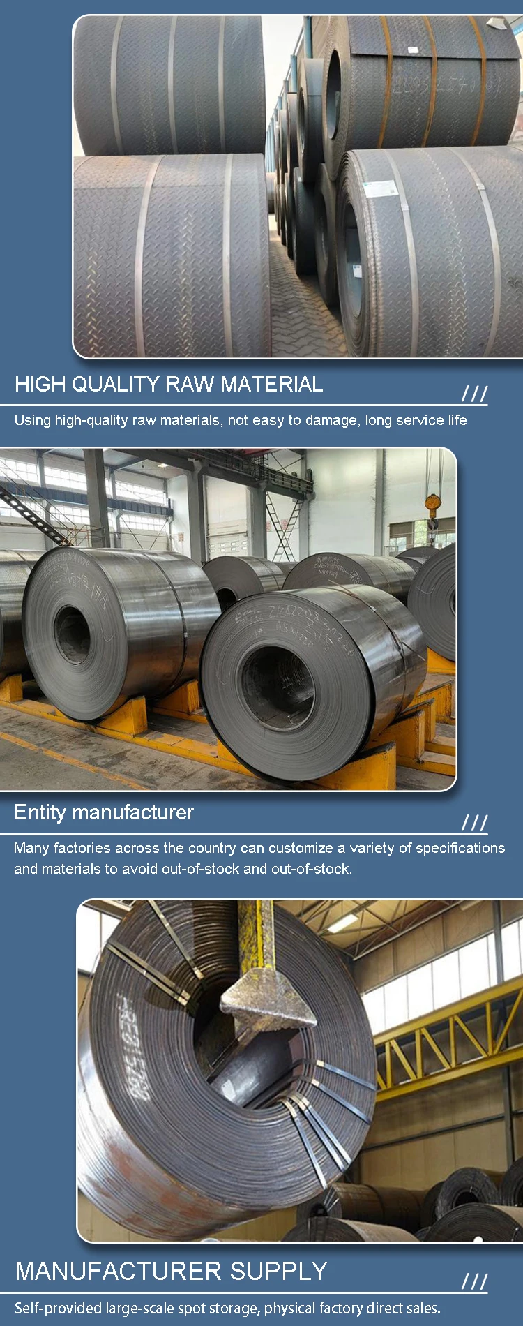 Thickness | Hot-rolled thickness: 2.75 mm-10 mm, according to your requirements Cold-rolled thickness: 0.2mm-3mm, according to your requirements |