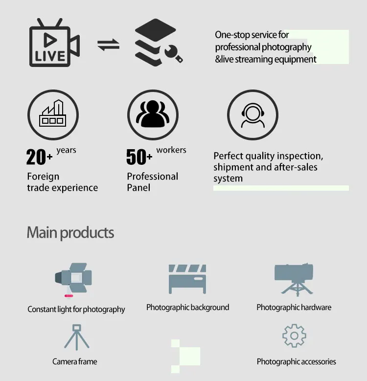 A: We provide one-stop services for professional photography and live streaming equipment. With over 20 years of experience in foreign trade, a professional sales team, and a comprehensive quality inspection, and shipping, and after-sales system.