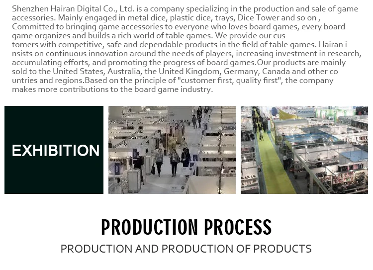 Shenzhen Hairan Digital Co., Ltd. is a company dedicated to the production and sales of game accessories, with a primary focus on metal dice, plastic dice,stone dice,dice trays, and dice towers.