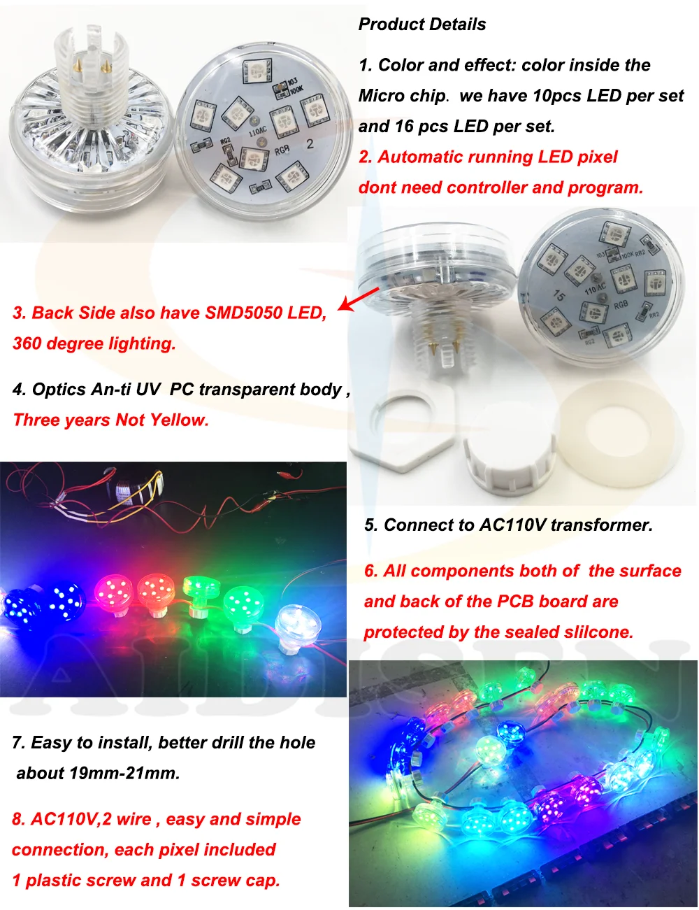1. This product is made up of PCB, plastic cover and base, 2-pins connectors. As well as a series of gluing process to ensure good water and UV resistance.