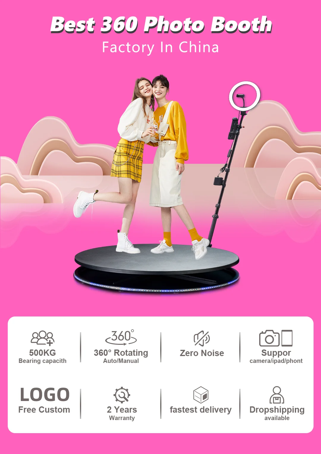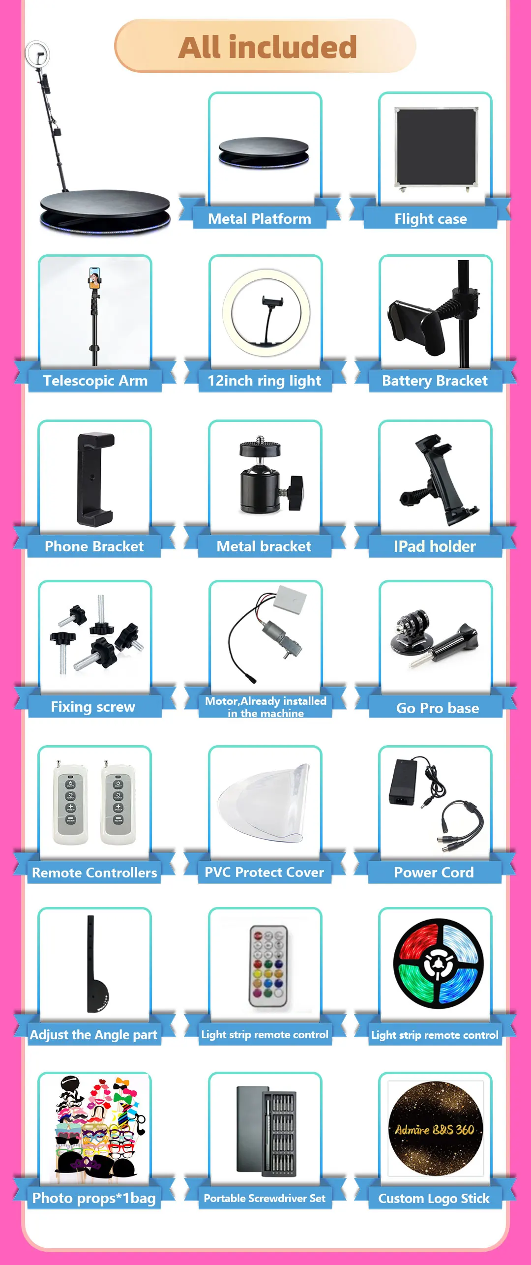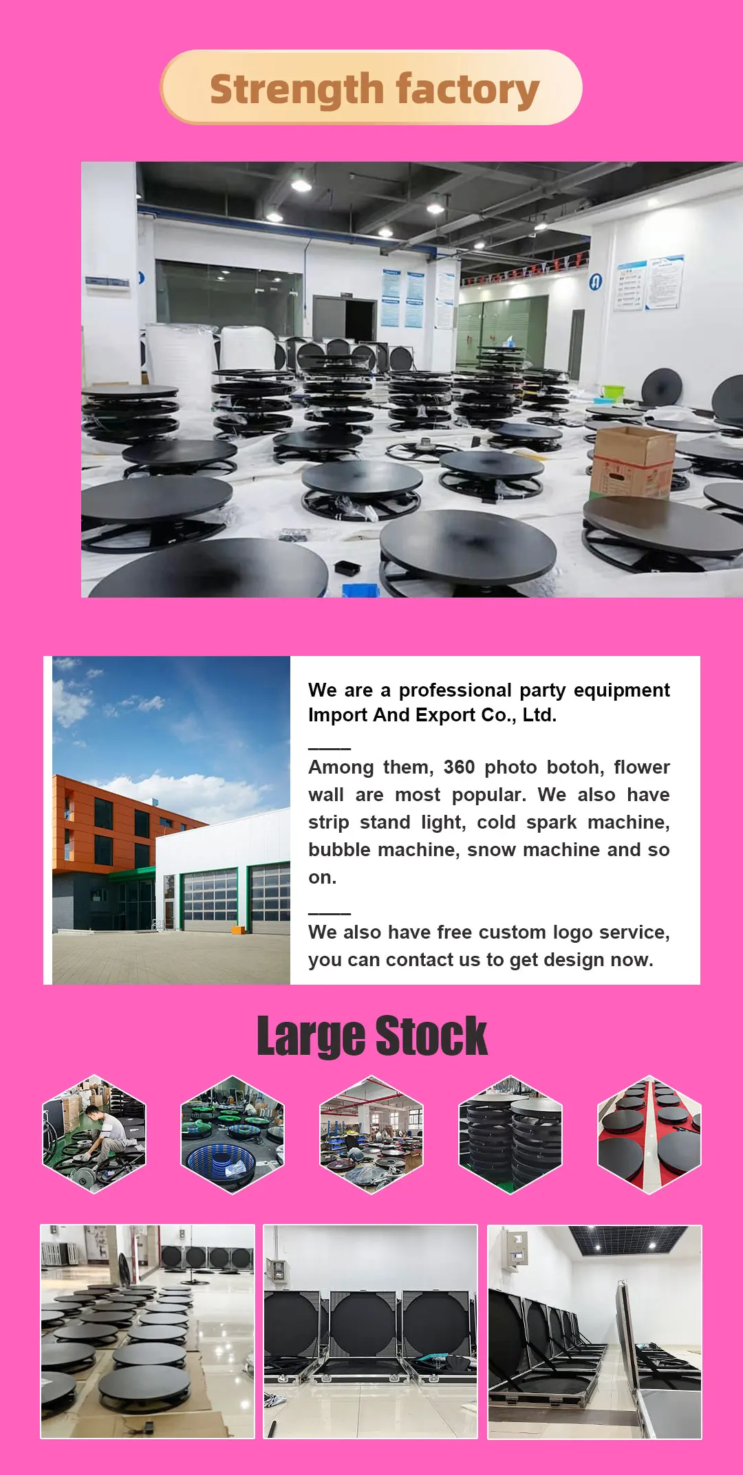 1. Are you a factory specializing in party supplies? Yes,we are engaged to develop party supplies and wedding supplies. We have 360 photo booth,overhead 360 photo booth,360 photo botoh enclosure backdrop, ipad photo booth,mirror photo booth and many more Customizable party supplies.