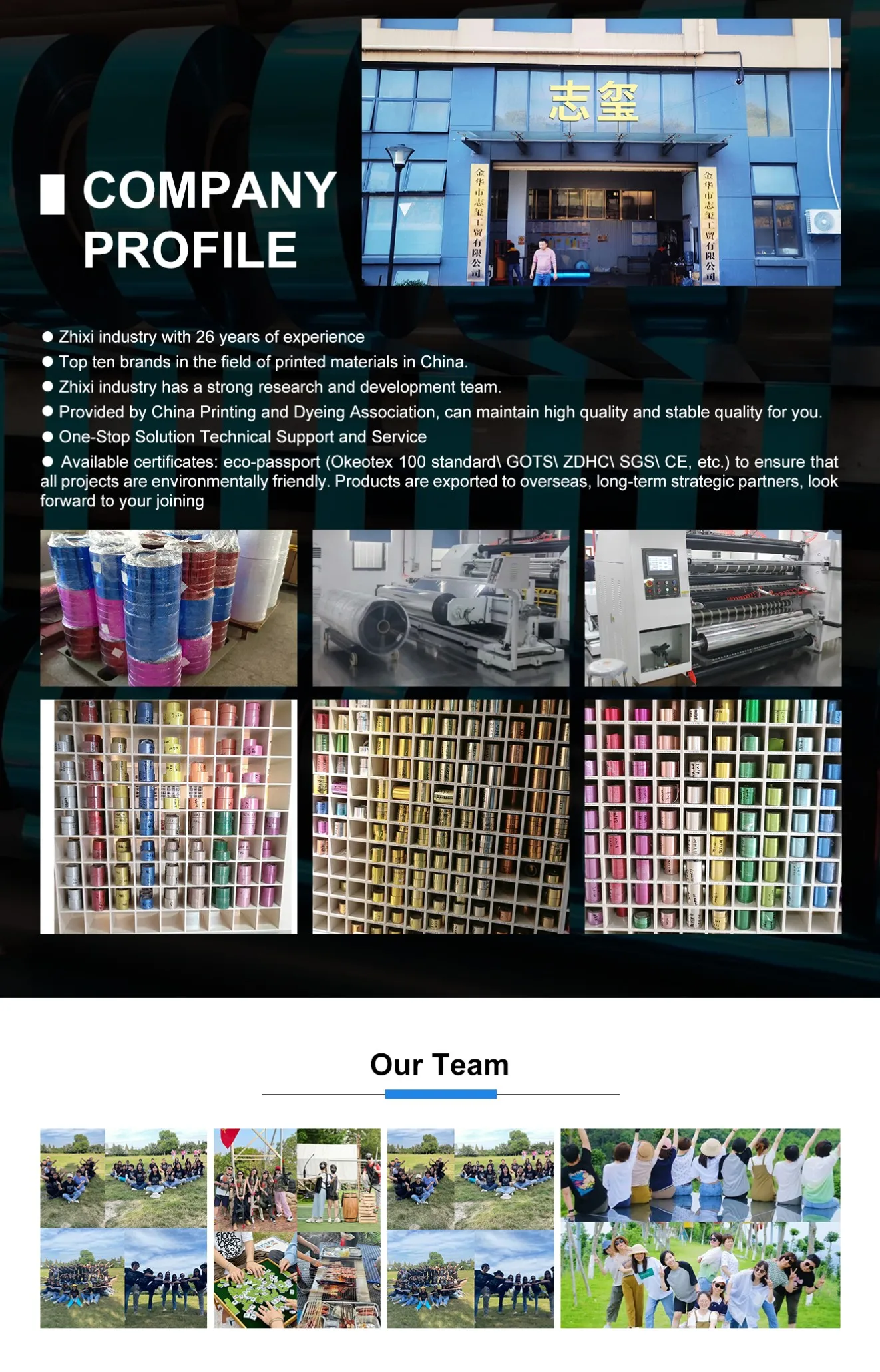 Jinhua Zhixi industry and Trade Co., Ltd., established in 2020, is a professional manufacturer specializing in gold and silver silk film, laser film, transparent film, gold and silver wire, rain silk door curtain and other products. It has more than 20 years of experience in this industry. Our company is mainly exported to the Middle East, Pakistan, India and Southeast Asia. Our products are mainly processed for textile enterprises and gift and handicraft enterprises.What we offer: 1) Good quality control 2) Highly competitive prices 3) state-of-art technology products 4) Best professional team 5) Smooth communication 6) Effective OEM&ODM service