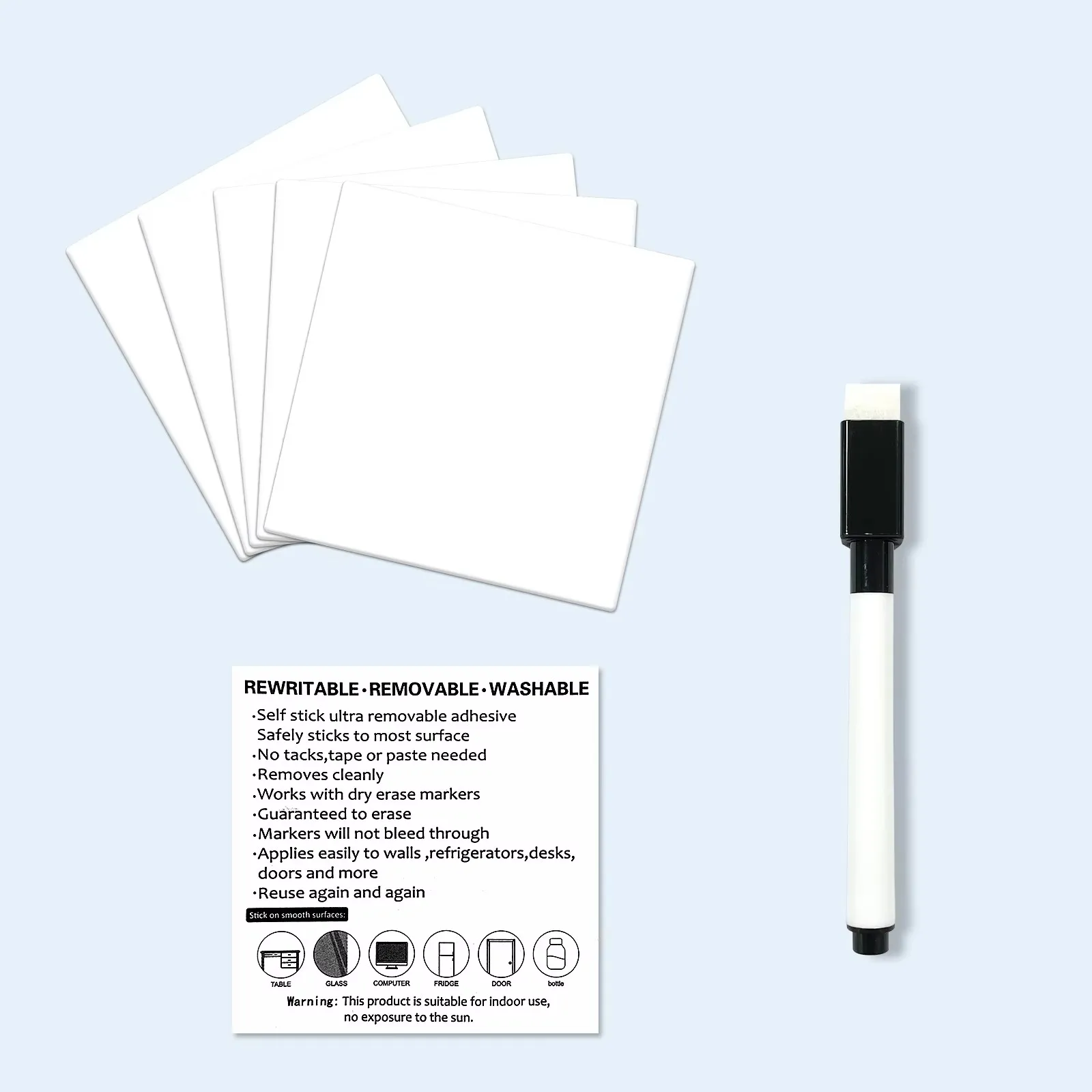 Usage | Works with dry erase markers. Good choice for office, teaching and doodling. | Wide Applications | Made from high-quality PET+PU. Directly stick it to walls, refrigerators, desks, doors and more. |