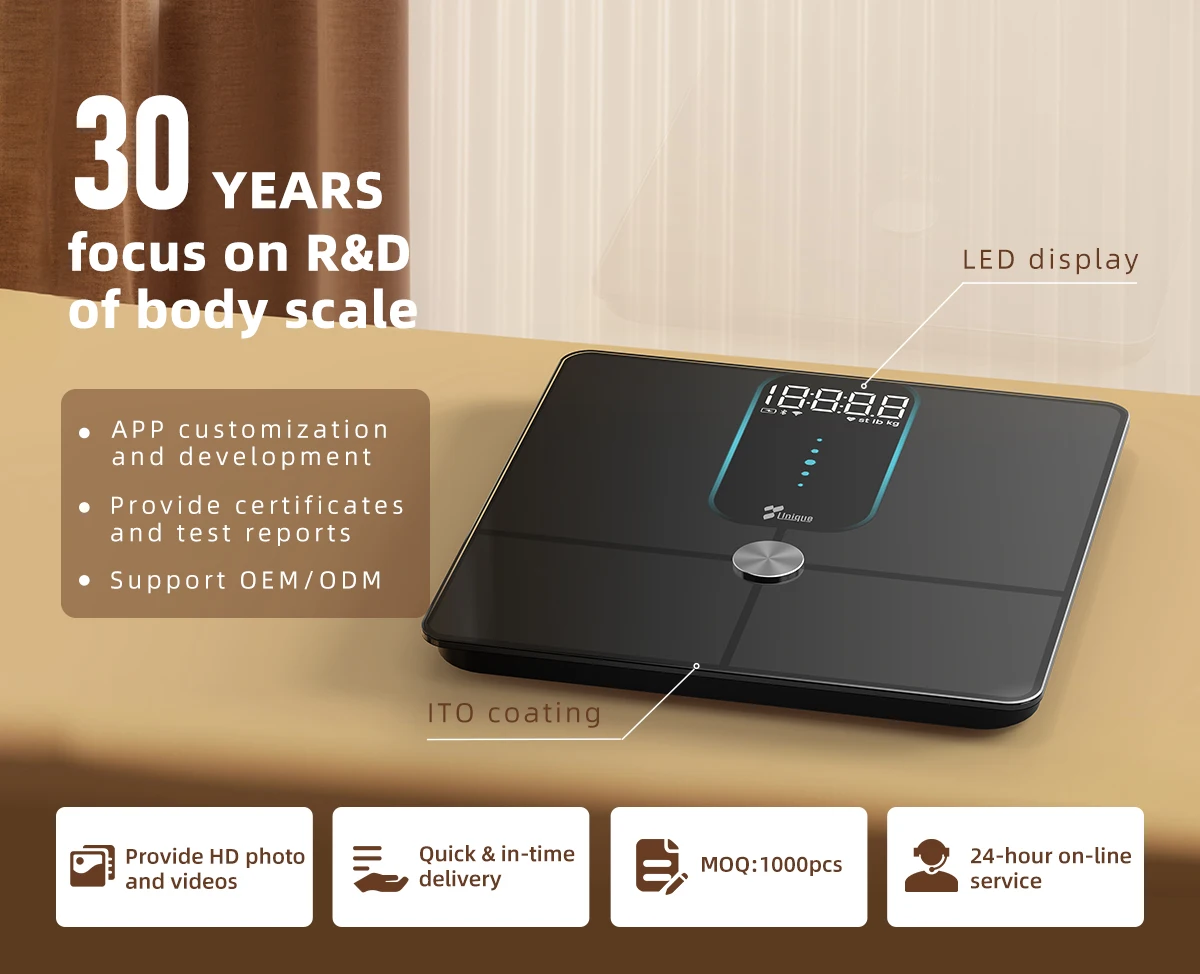 ● Bluetooth Low Energy Module compatible with iOS&Android systems ● 25 Measured Parameters: Weight/heart rate/BMR/BMI/Fat ratio/Fat mass/Muscle rate/Muscle mass/Protein ratio/Water ratio/Subcutaneous fat ratio/Skeletal muscle ratio/Skeletal muscle mass/Obesity level/Fat control/Muscle control/Weight control/Standard weight/Fat-free mass/Visceral fat/Bone mass/Body type/Body age/Health evaluation/Health score ● High-end LED hidden screen display ● Stainless steeltrim cover ● High-strength tempered glass ● Small item weighing ● Intelligent heartrate monitoring | |||