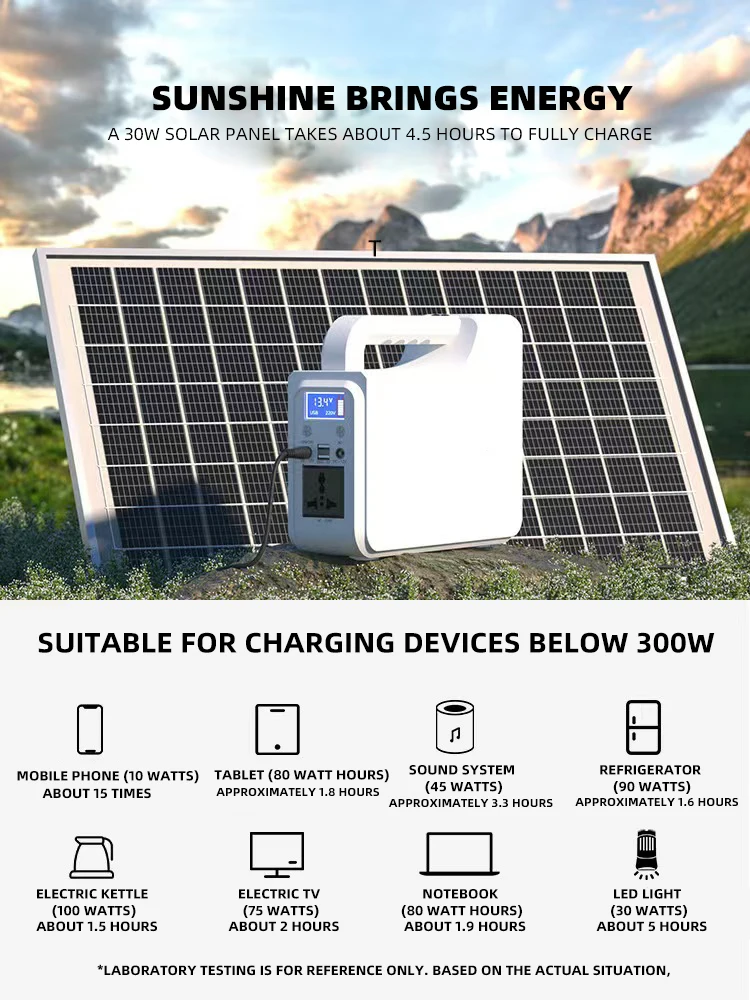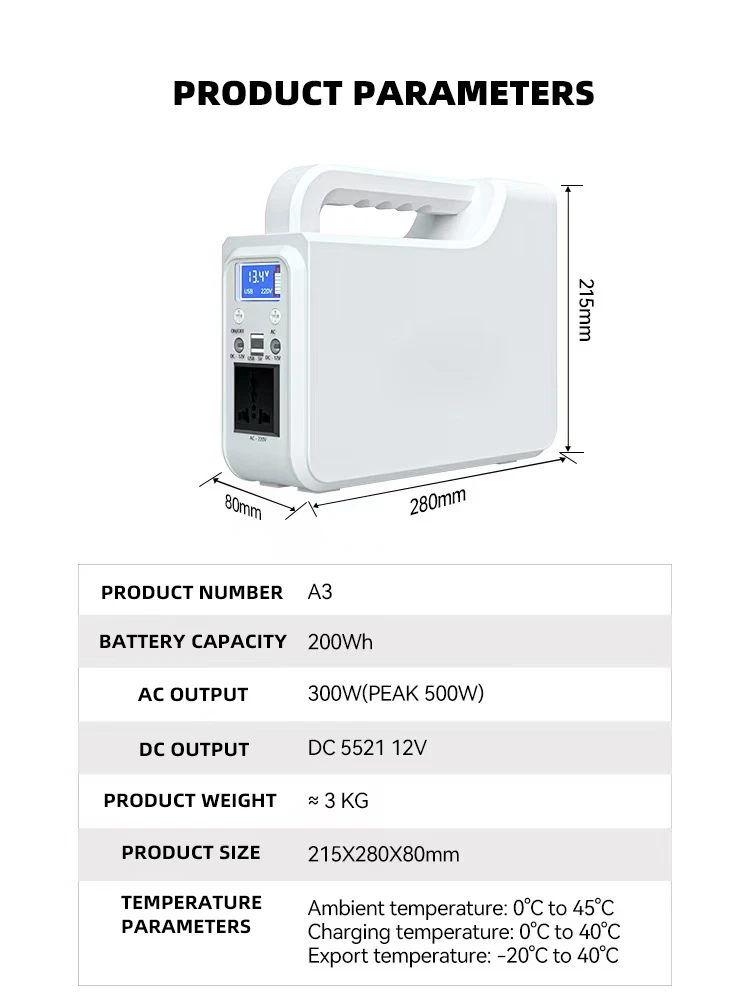 Our A3 300-watt and 200-watt-hour portable power station with a LifePo4 battery has the following selling points: 1. Powerful Output: With a 300-watt power output, it can meet the electricity needs of various devices, such as laptops,mobile phones,cameras, and small household appliances, providing stable and reliable power supply in different scenarios. 2. Long Battery Life:The Lifepo4 battery offers a relatively long lifespan. It can be cycled many times, ensuring long-term use and reducing the frequency of battery replacement, which is cost-effective for users in the long run. 3. High Safety: LifePo4 battery have high safety performance. They are more stable in high-temperature and over-charging situations, greatly reducing the risk of explosion and fire. This makes the portable energy storage power supply safer to use, especially in outdoor or complex environments. 4.Lightweight and Portable: The overall design is lightweight and portable, making it convenient for users to carry during outdoor activities, travel, or in case of power outages. It can be easily put into a backpack or carried by hand, providing power support anytime and anywhere. 5. Multiple Output Interfaces: It is equipped with various output interfaces such as... A 100 - watt (power output) and 200 - watt - hour (capacity) portable power station can support several low - power household appliances. For example, it can power a laptop (usually around 30 - 60 watts), a few LED lights (each around 5 - 15 watts), a mobile phone charger (about 5- 10 watts), and a small fan (around 20 - 40 watts). The number of appliances it can support at the same time depends on the total power of the appliances not exceeding 100 watts. You need to calculate the sum of the power of each appliance you want to use to determine how many can be plugged in. For example, if you want to use a laptop (60 watts) and two LED lights (10 watts each), the total power is 60 + 10*2 = 80 watts, so these three appliances can be used together. | ||