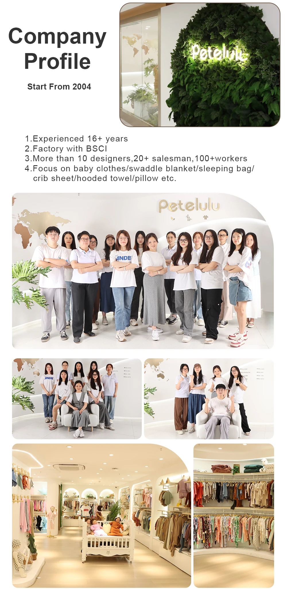 Guangzhou PETELULU co.,ltd ,founded in 2004,is a professional manufacturer of baby and children's clothing.the main product includes baby rompers,newborn baby gift set,jumpsuit,T-shirt,sweaters,family pajamas,etc. Our philosophy is "Dress on healthy ,live in love." AAA credit enterprise evaluation and SEDEX authentication is the proof. Giving the best for the children,PETELULU is your best choice.