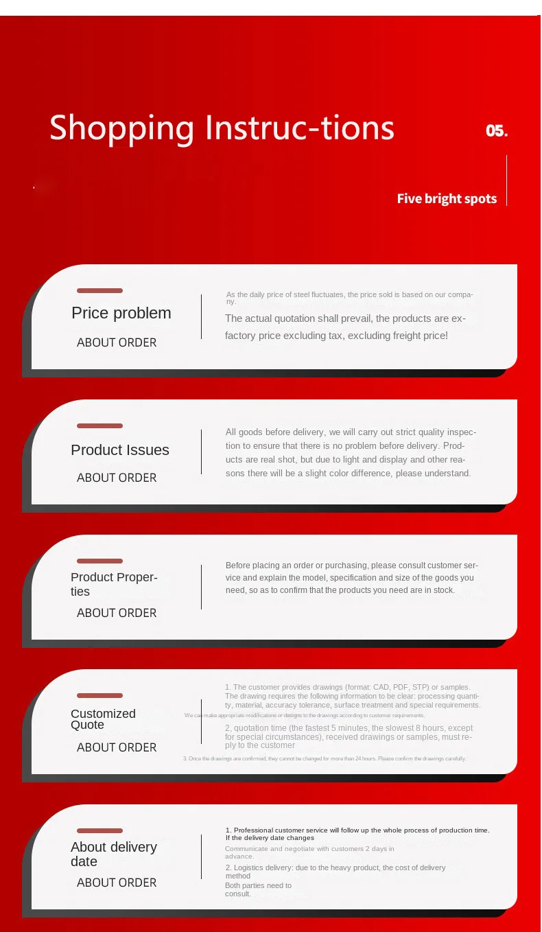 A4: Products in stock aregenerally 2-5 days after payment, and customized goods are generally 10-15 days after payment. Q5: What are your payment terms? A5: T/T50% as deposit, 50% balance before delivery.
