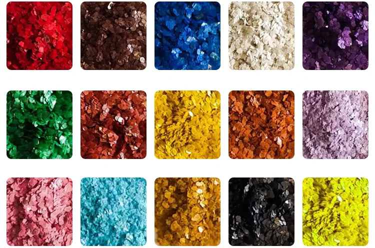 Dyed rock chips are made of finely selected mica flakes, which are divided and processed through many procedures, and then chemically treated, which makes up for the characteristics of the natural rock chips that are not brightly colored and have fewer varieties. | |
