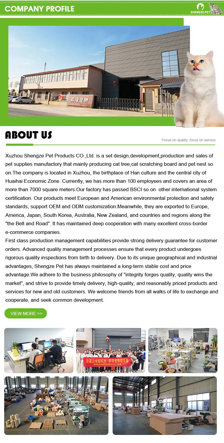 1: Are you a factory or a foreign trade company? We have factory to produce cat tree and Pet Nest so on pet products 2: Why we can choose you? 1): Factory---we are the manufactory, so have competitive price. 2):quality---We have an advanced quality management system. 3):efficiency---We have advanced equipment and production lines 3: Does it support customizing cat trees Yes, you can provide a picture of the cat tree so we can make a sample 4:How about the price?Can you make it cheaper? The price depends on the item your demand(Shape,size,quantity) Beat quotation after receving full description of the item you want. 5:How about the sample time? Sample time:3~10days after order & samples confirmed.